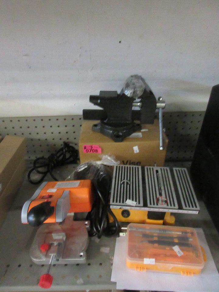 Mini cut off saw, 4" table saw, vise & screwdriver set