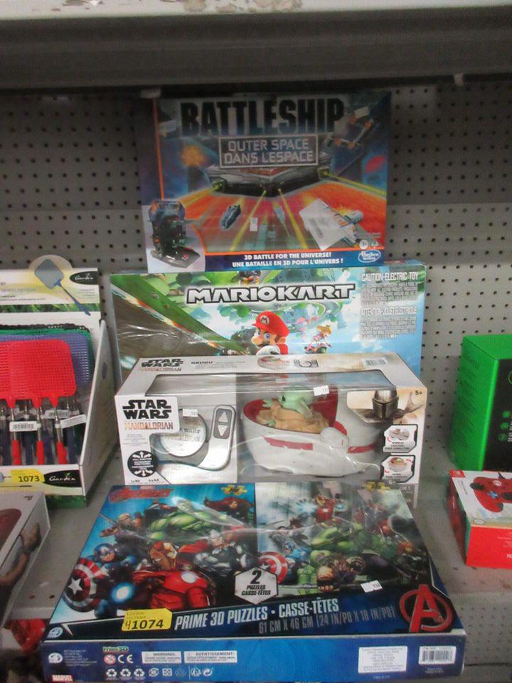 Battleship Outer Space, MarioKart, Star Wars Mandalorian Grogu Hover Pram and Avengers 3D puzzle.