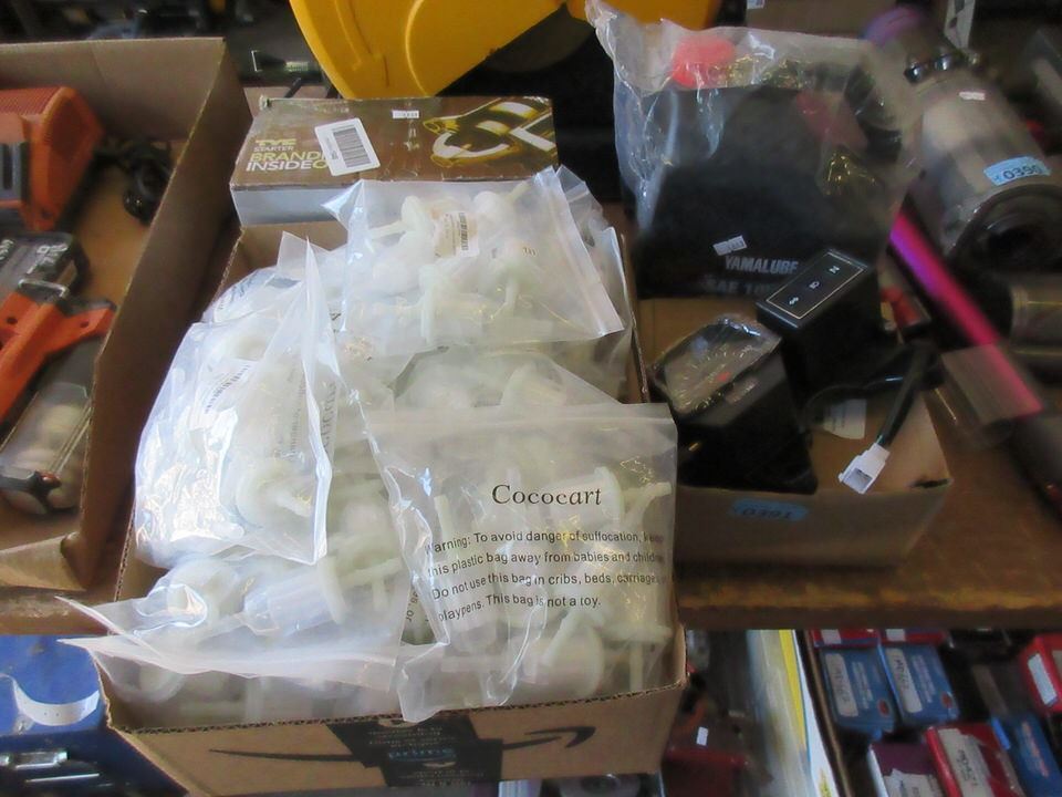 Motorcycle speedometer, Jug of 10W40 oil, box of gas filters and a starter motor.