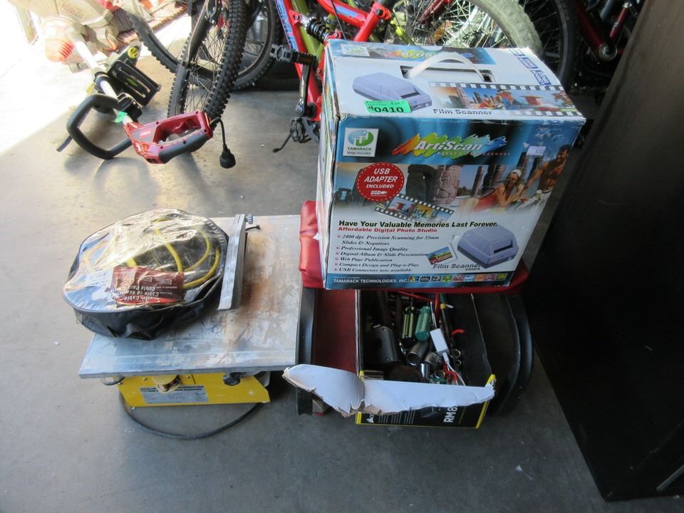 Rolling shop set with hand tools, tile saw and jumper cables.