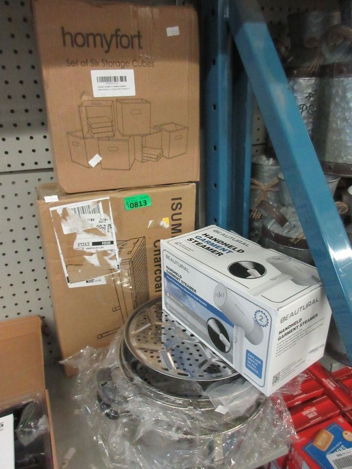 Garment steamer, table top charcoal grill,  storage cubes and a cooking pot.