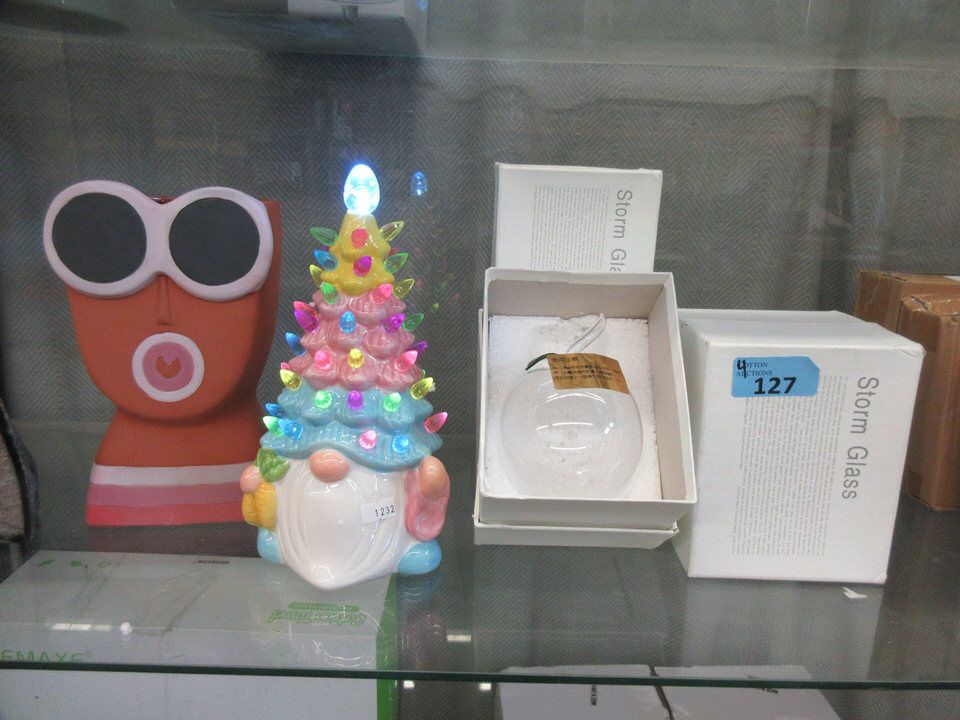 10" Illuminated Troll Tree, Pottery Vase, and 2 Storm Glass Apples.