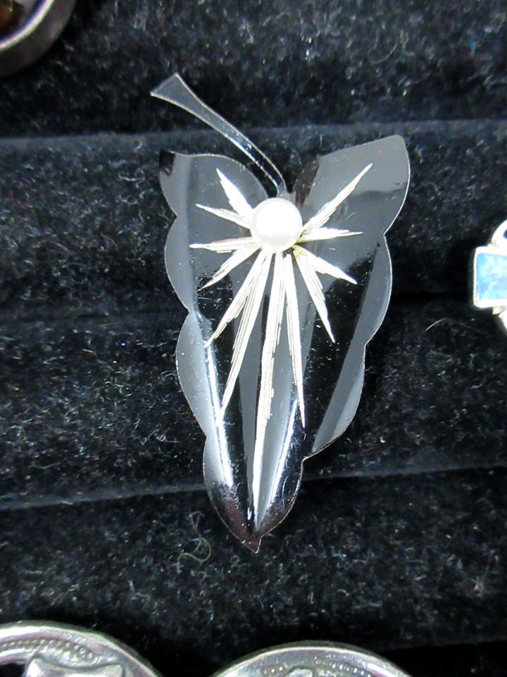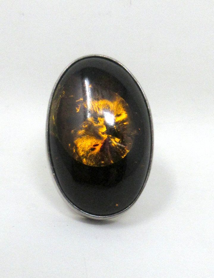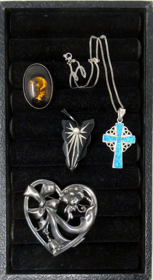 Vintage enameled Japanese brooch, 53 mm floral brooch, amber ring with 20 x 31 mm face and cross with 18" sterling chain.