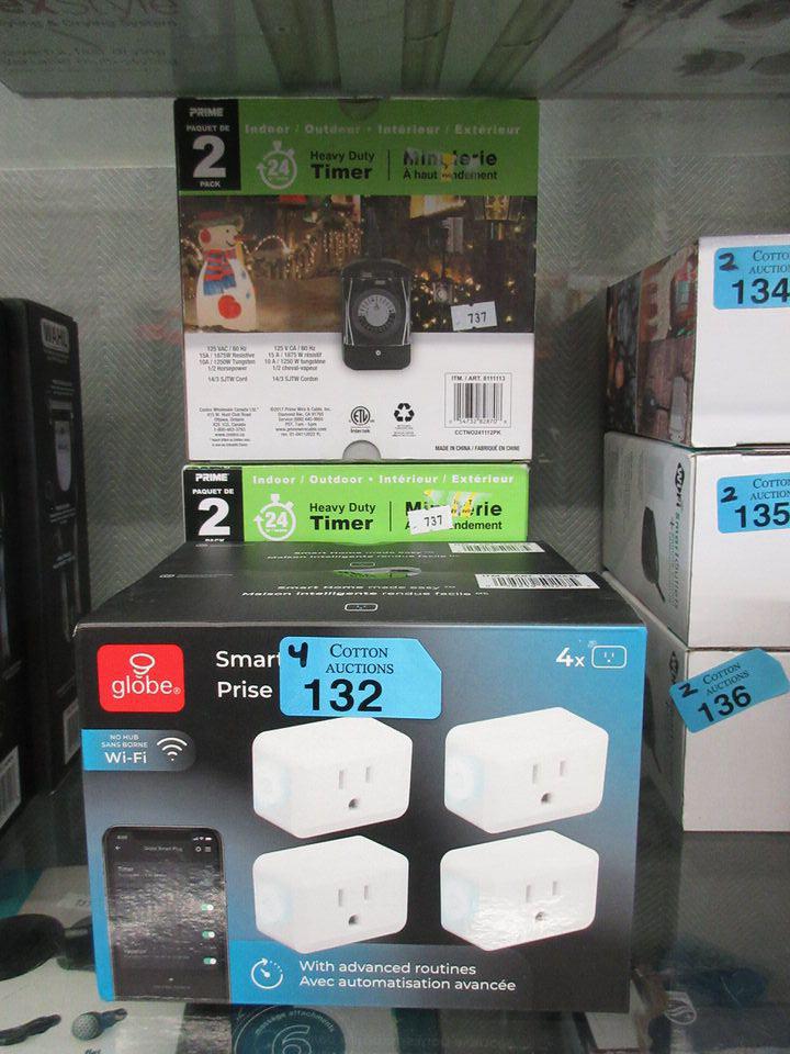 2 Sets of 2 heavy duty indoor outdoor timers and 2 sets of 4 Globe brand smart plug ins. Customer returns.