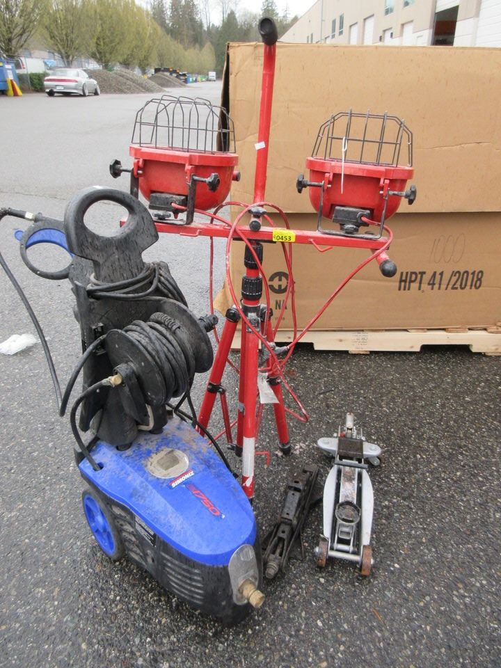Simoniz pressure washer, industrial work light, floor jack and small scissor jack.