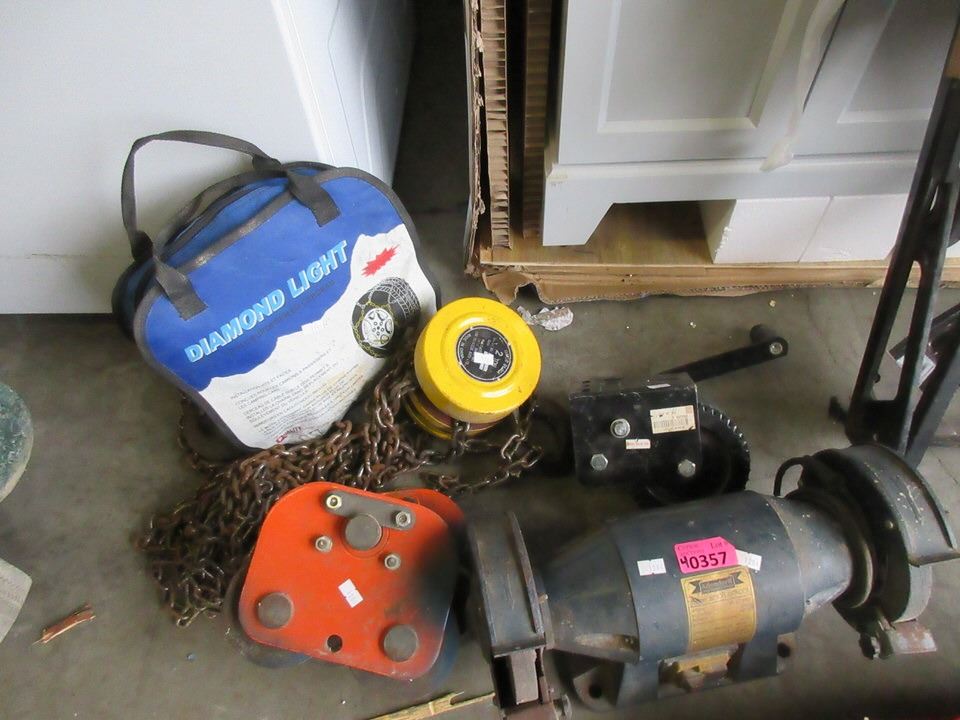 Bench grinder (cord cut off), come-along winch, chain hoist and tire chains.