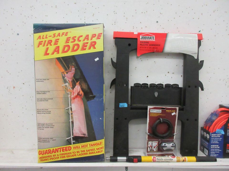 Escape ladder, extension pole, bike lock and plastic sawhorse.