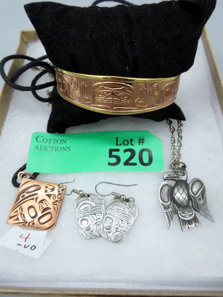 Copper cuff bracelet, 2 Necklaces and a pair of earrings