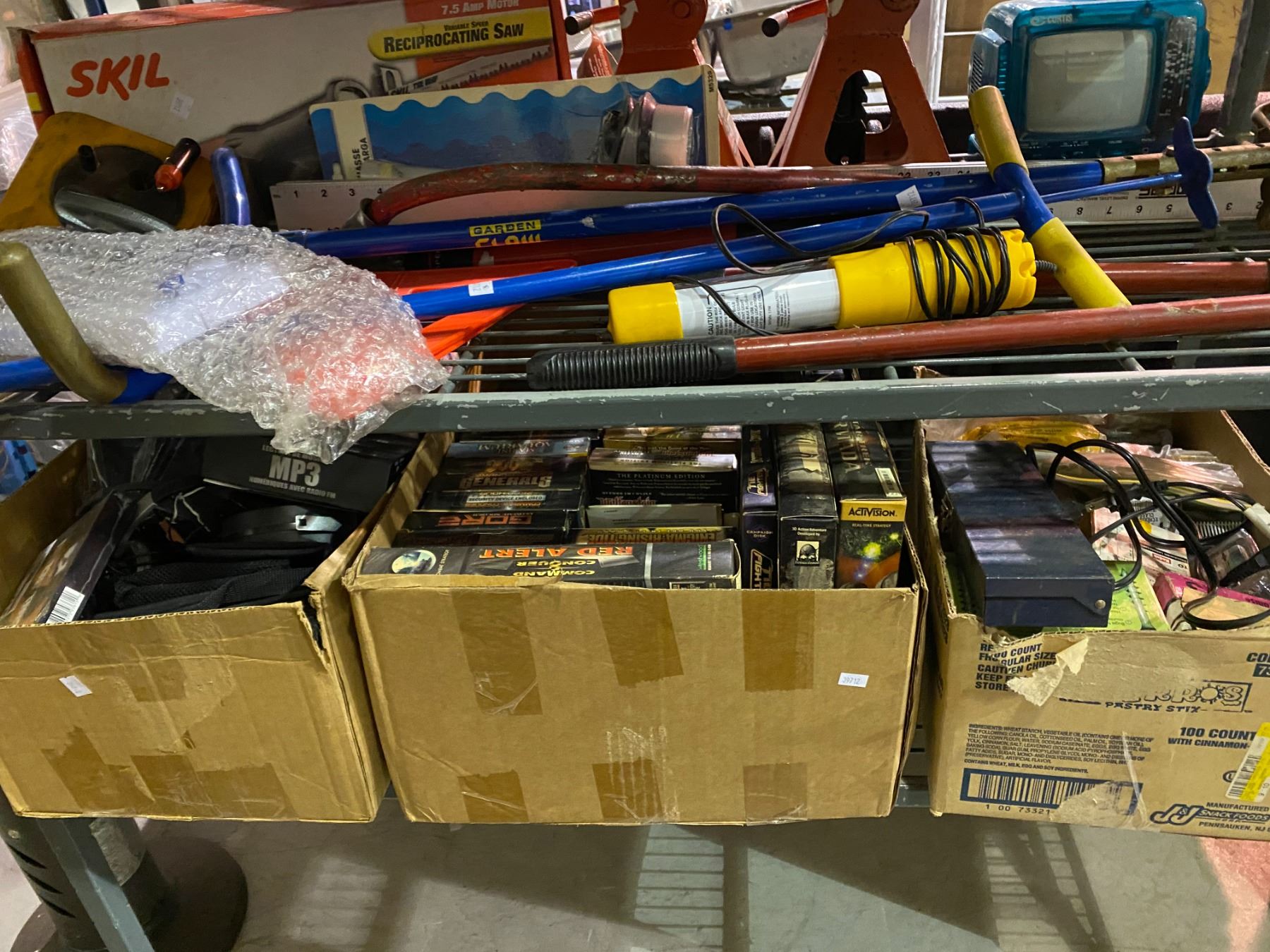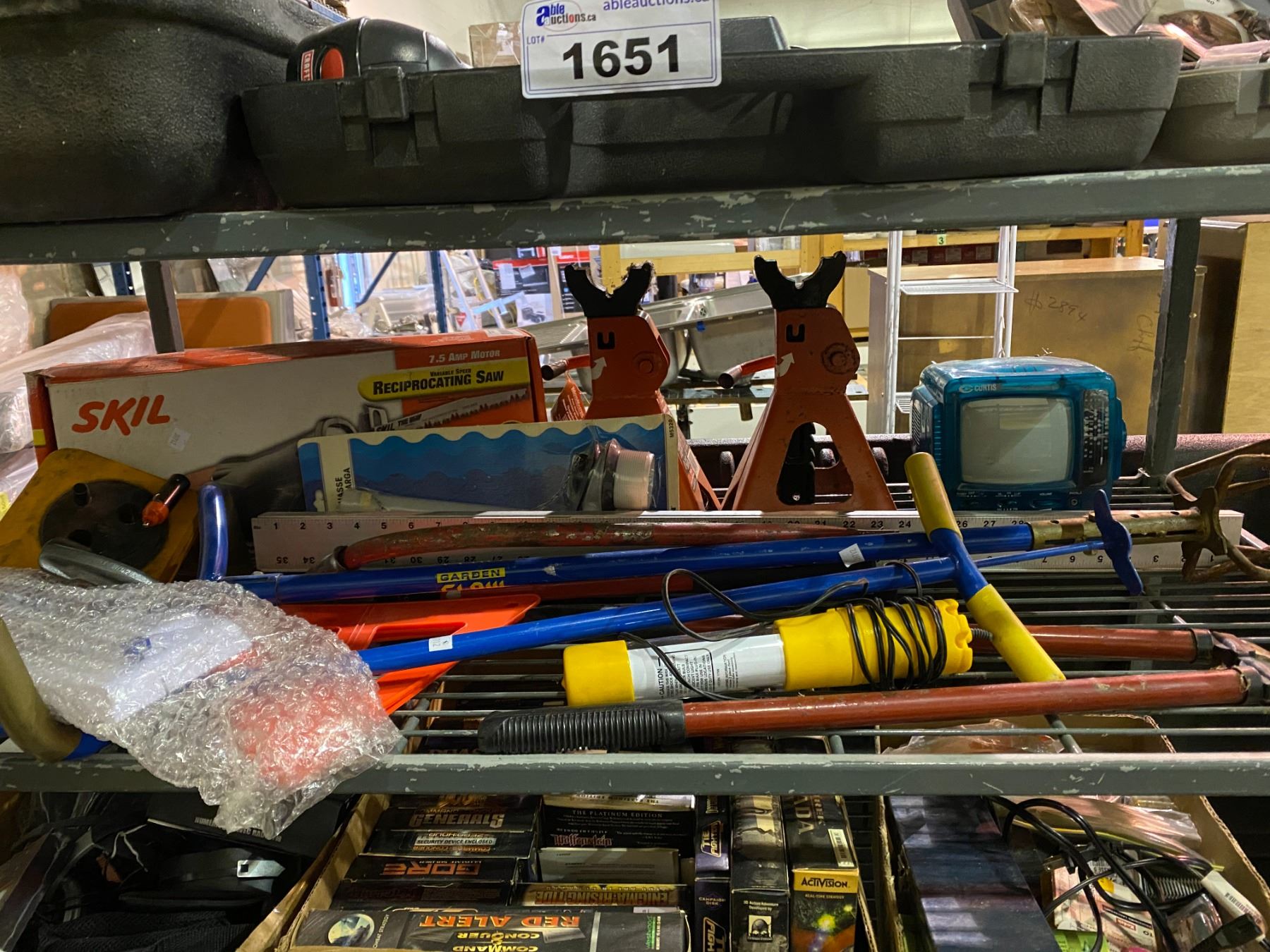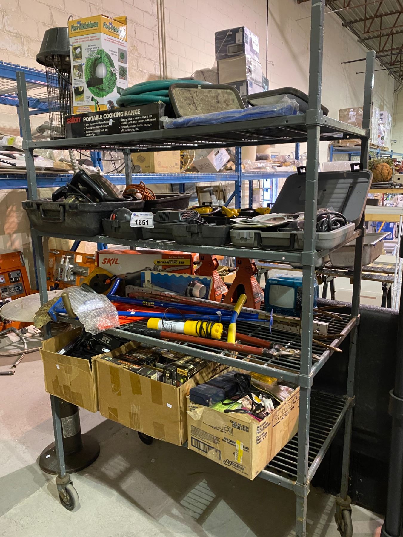 4 RACKS OF ASSORTED STORAGE LOCKER GOODS: POWER TOOLS, HAND TOOLS, CAR JACKS, GAMES, & MORE