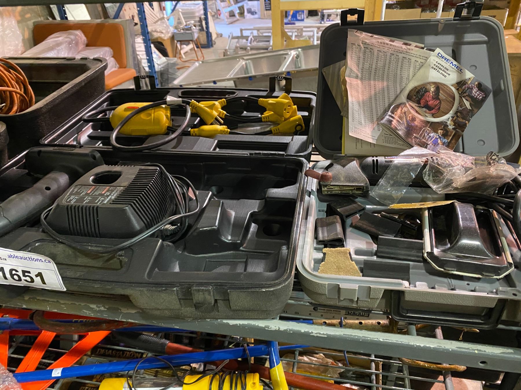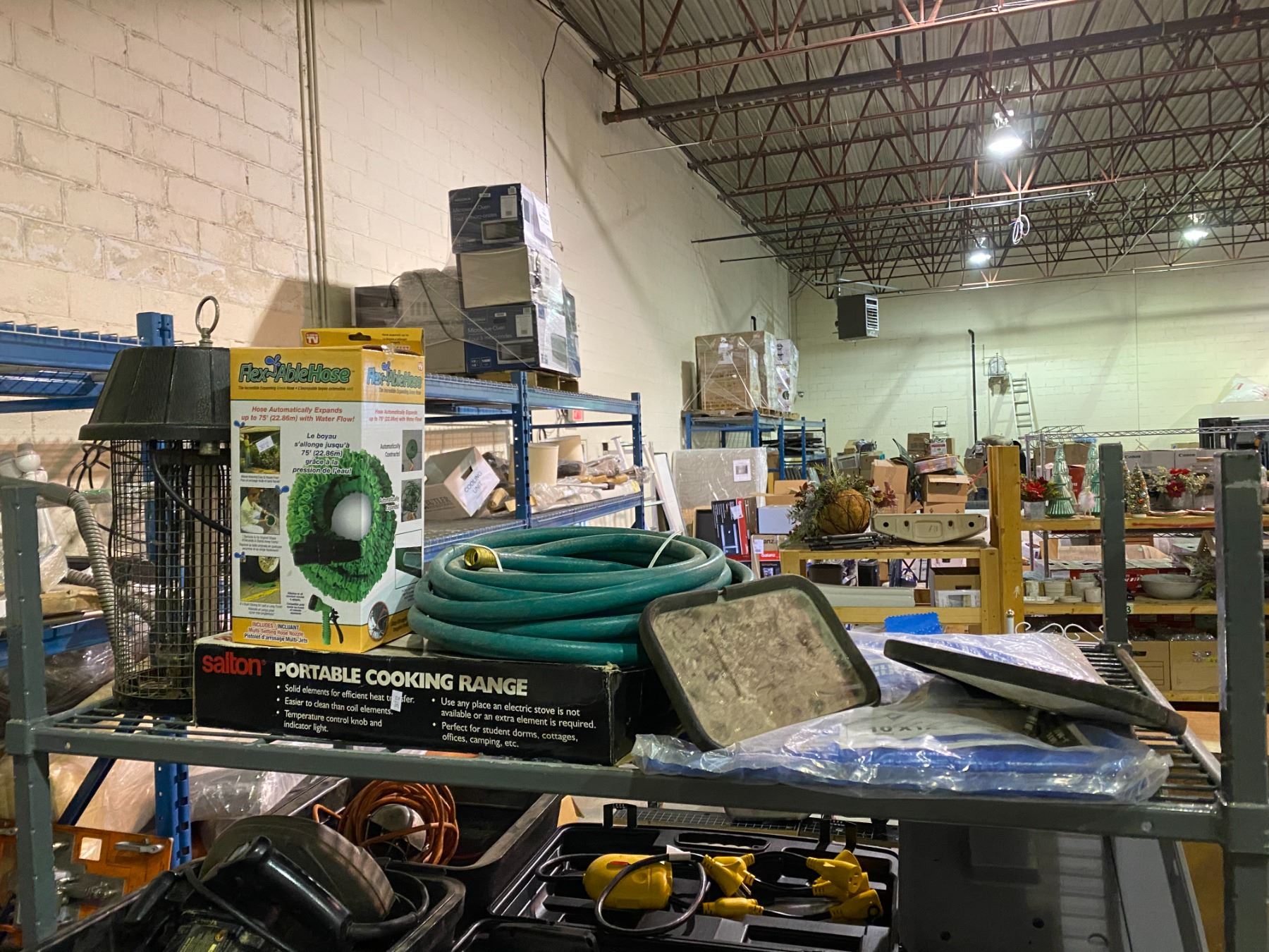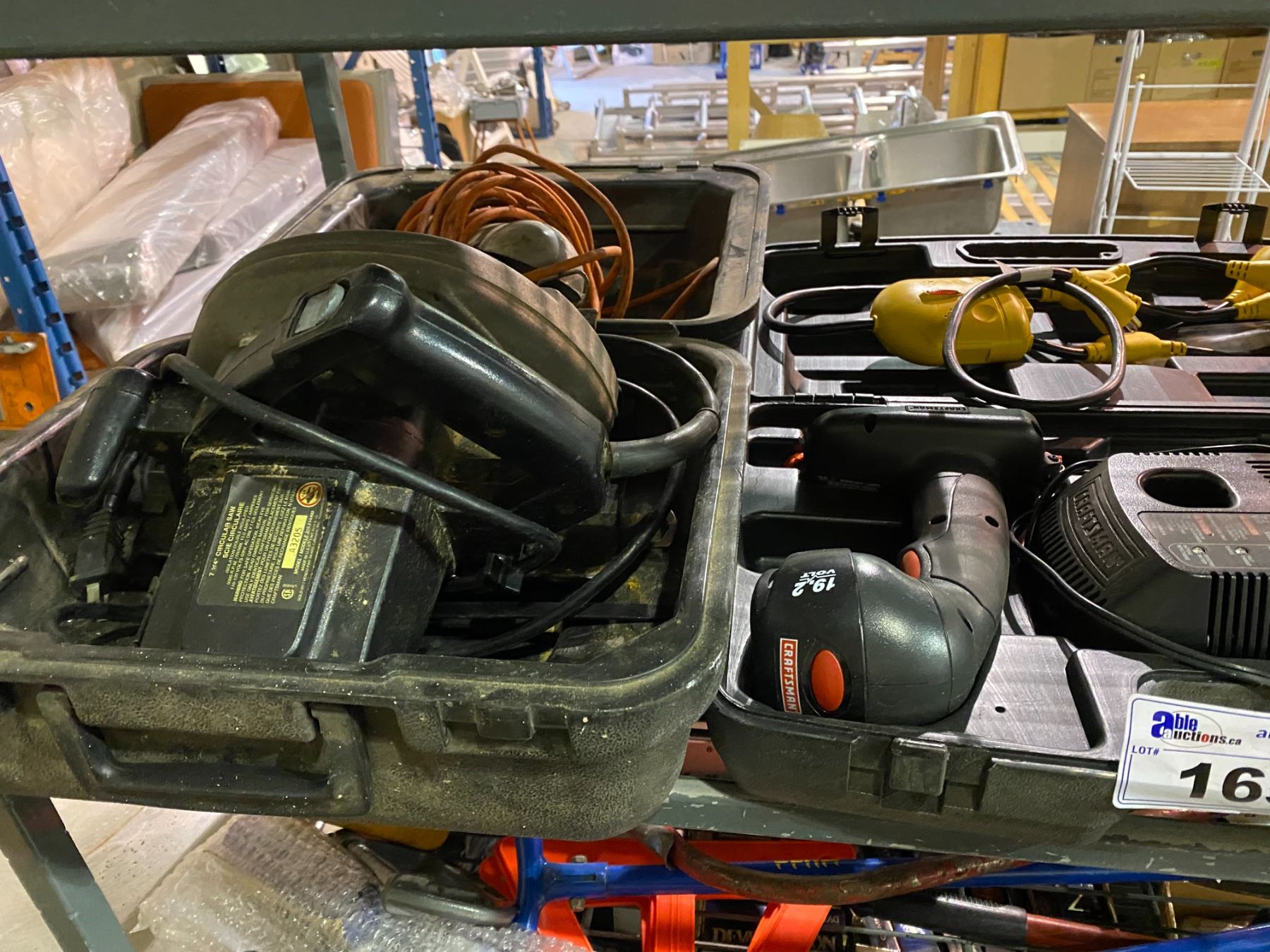 4 RACKS OF ASSORTED STORAGE LOCKER GOODS: POWER TOOLS, HAND TOOLS, CAR JACKS, GAMES, & MORE