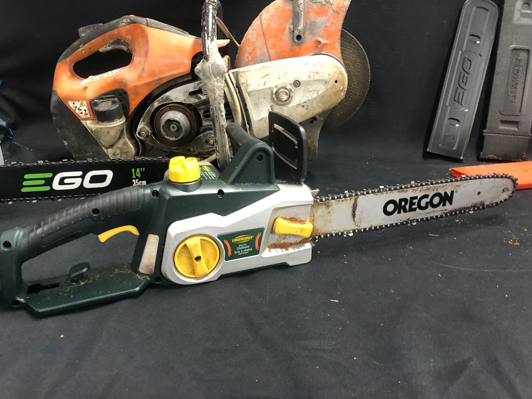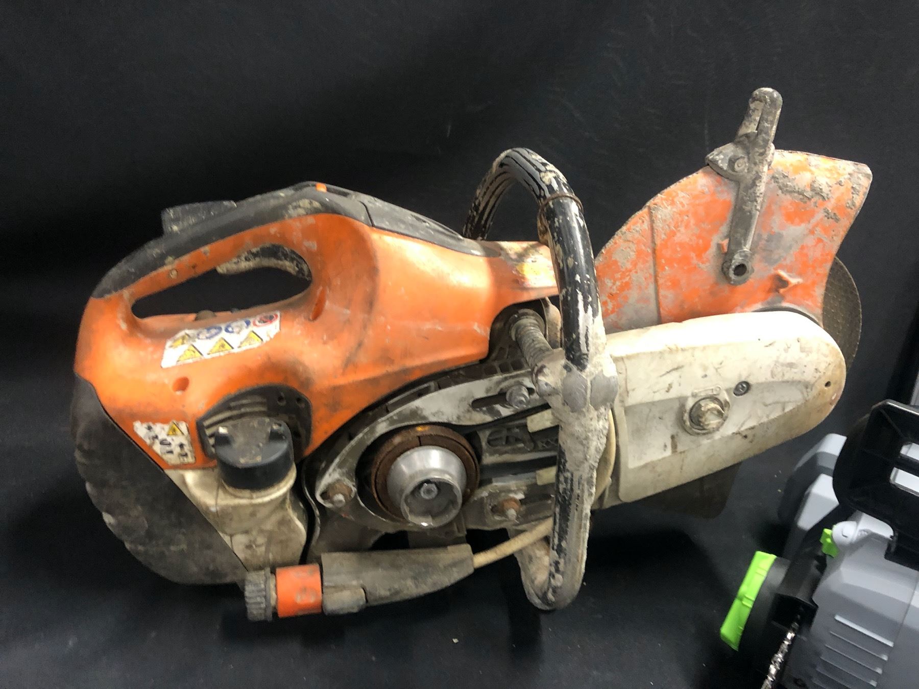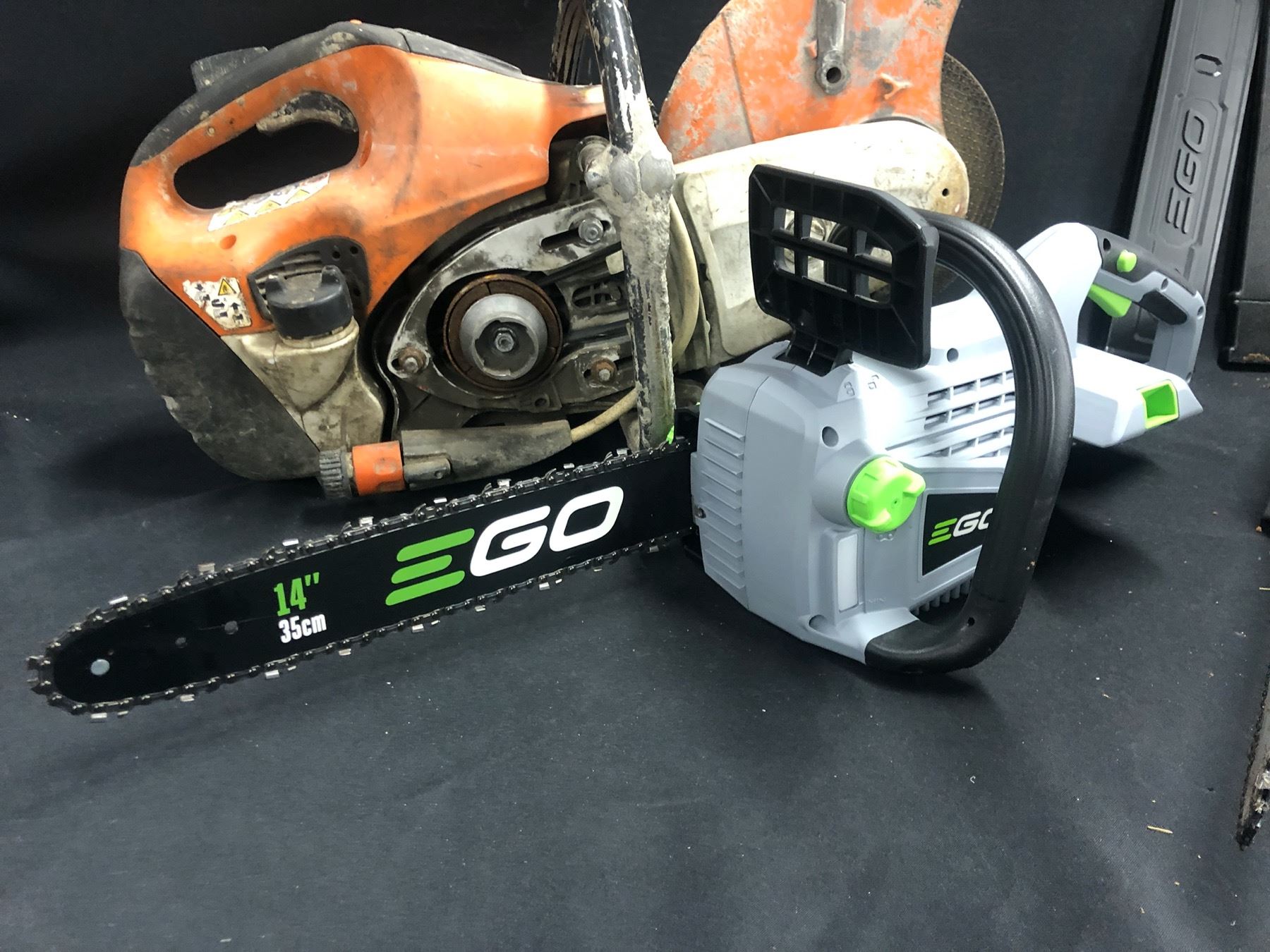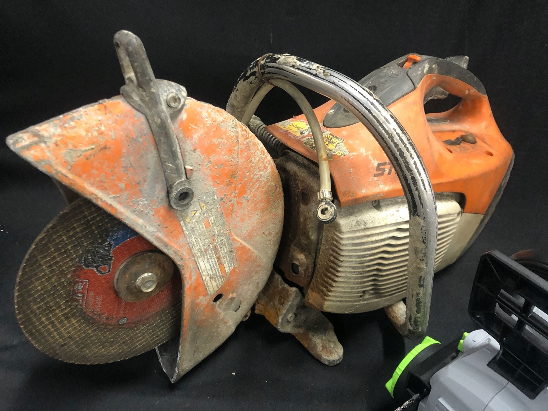 4 SAWS INC. STIHL CONCRETE SAW, EGO 56 VOLT CORDLESS CHAINSAW (NO BATTERY, ON CHARGER), YARDWORKS