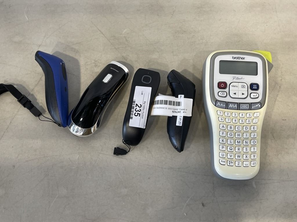 4 SMALL BARCODE SCANNERS AND BROTHER P-TOUCH LABEL MAKER