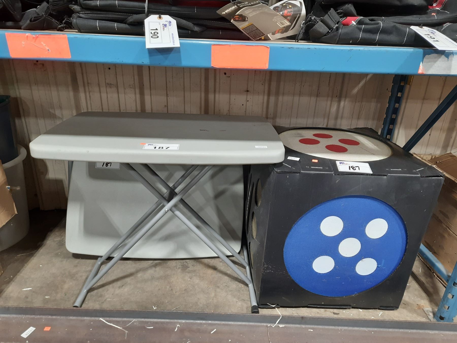 4 SMALL PLASTIC ADJUSTABLE FOLDING TABLES, & LARGE FOAM DICE SEAT