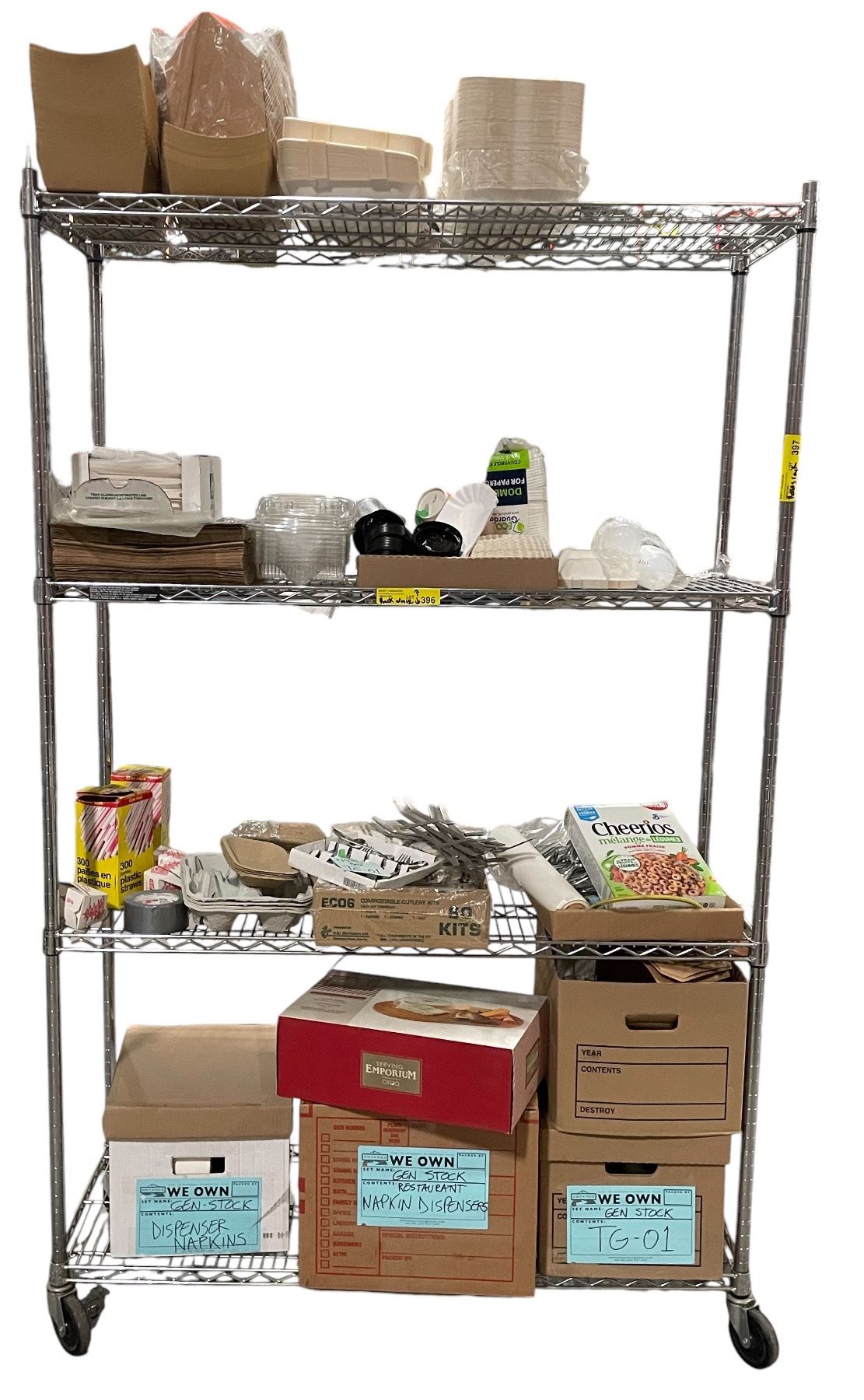 4 Shelves of Misc Including - Food Packaging, Napkin Dispensers, Straws, Utensils, Etc.
