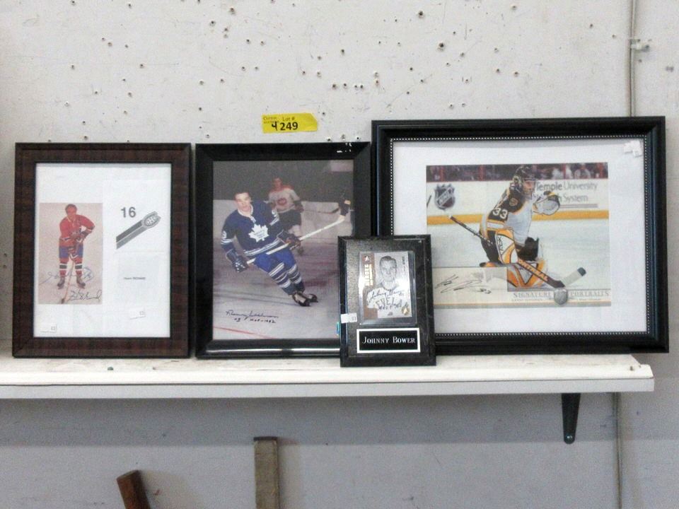 Henri Richard, Norm Ullman, and Hannu Toivonen photos. Johnny Bower signed and framed trading card.