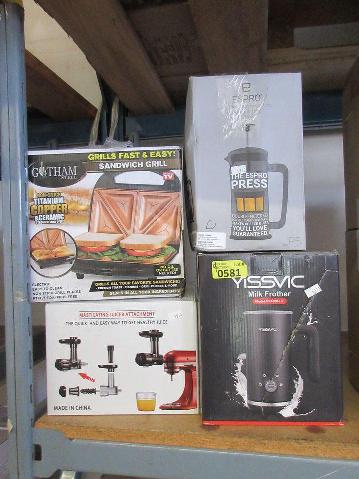 Stand mixer juicer attachment, Gotham sandwich maker, expresso press, and Yissvic milk frother.