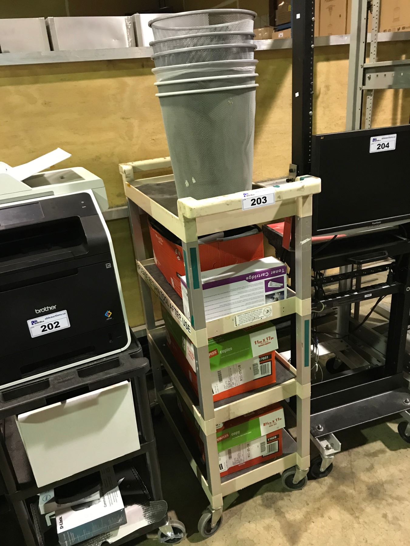 4 TIER MOBILE CART WITH ASSORTED COPY PAPER, TONER CARTRIDGE & WASTE BASKETS
