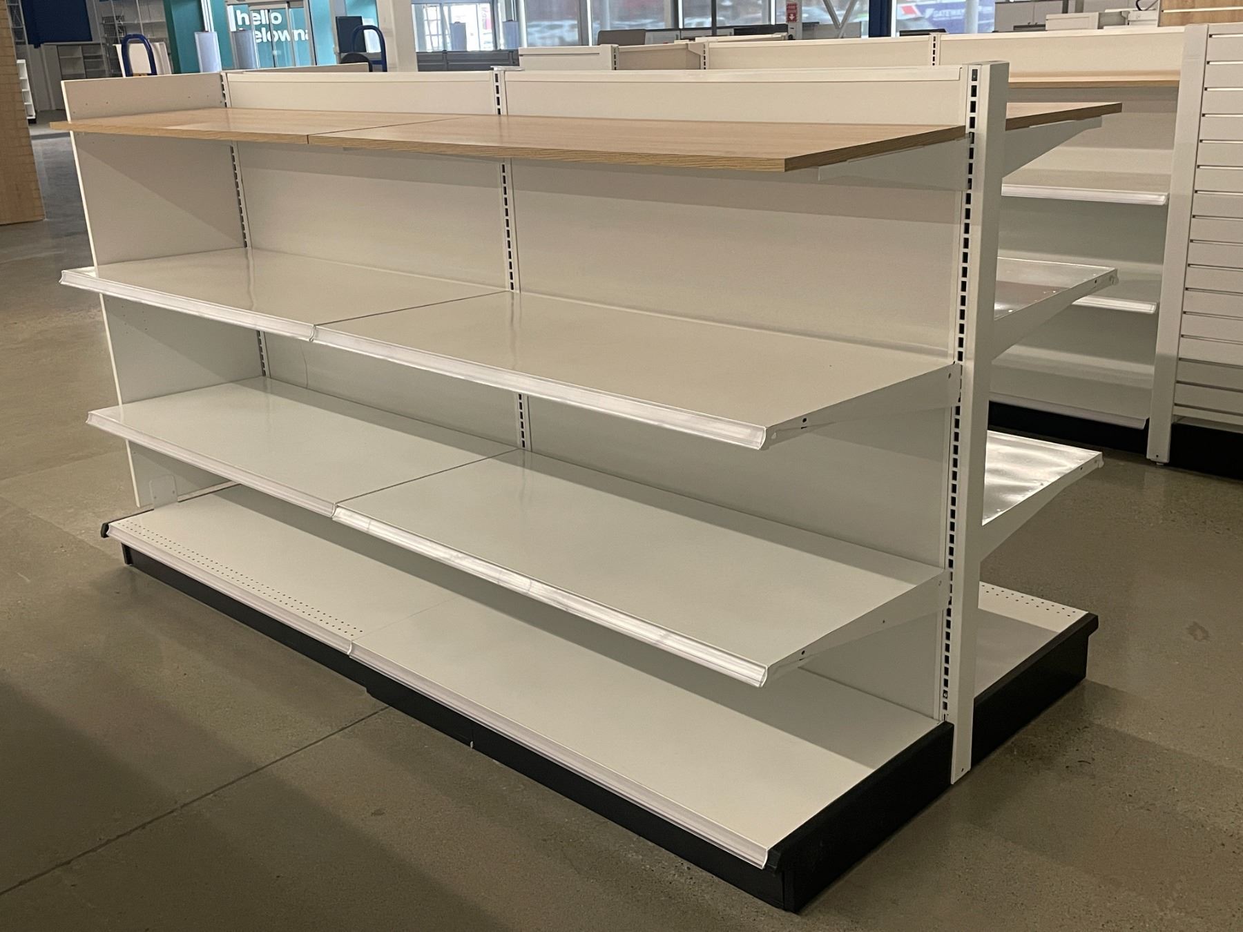 4 Tier retail double-sided gondola (approx. 98in W 55in H 43in D - excellent condition, Madix brand) BIDDERS ARE RESPONSIBLE FOR ALL COSTS ASSOCIATED WITH PICKUP OF THEIR LOTS INCLUDING BUT NOT LIMITED TO RENTAL OF EQUIPMENT, FORKLIFTS, LABOUR, TRUCKING, TOOLS ETC.