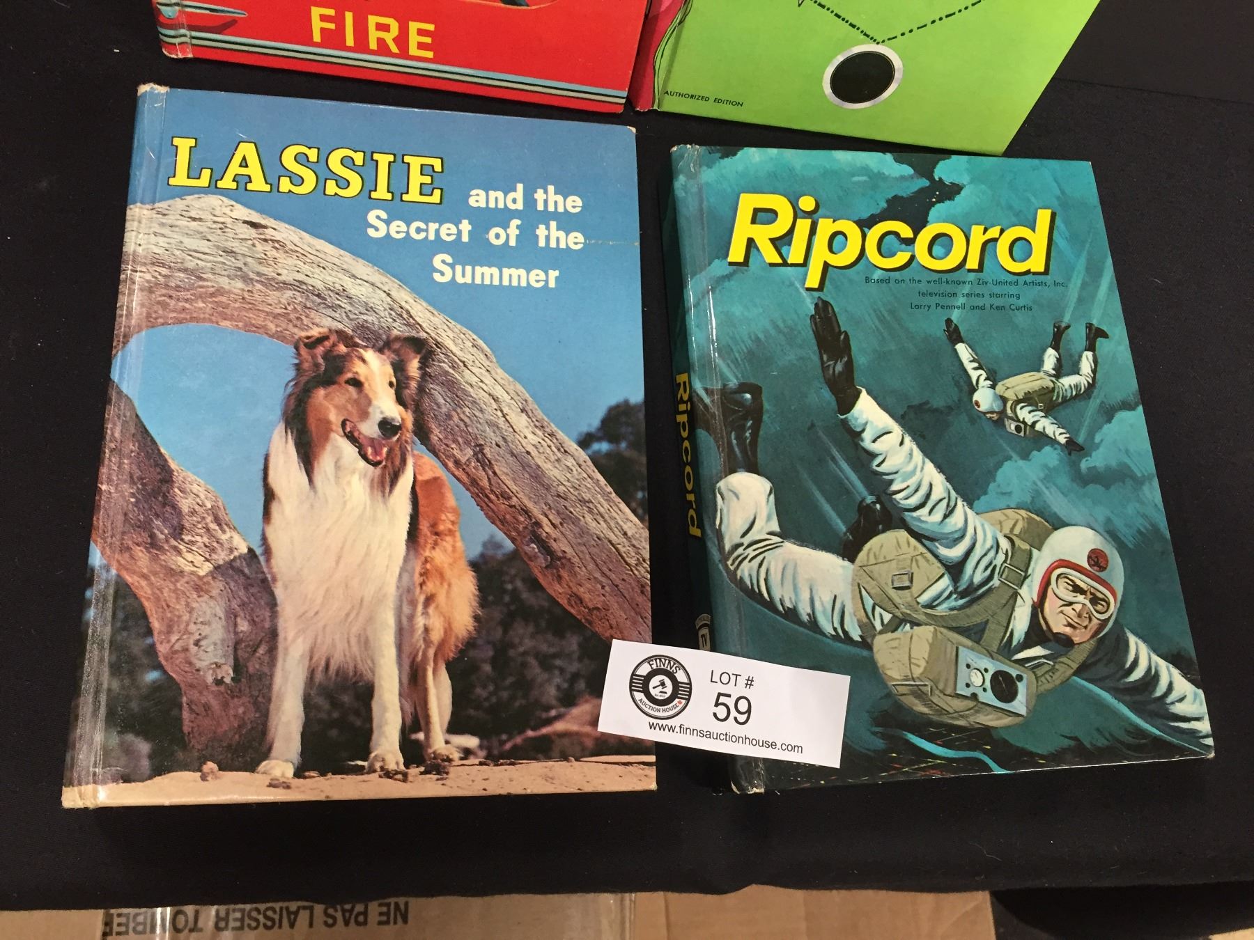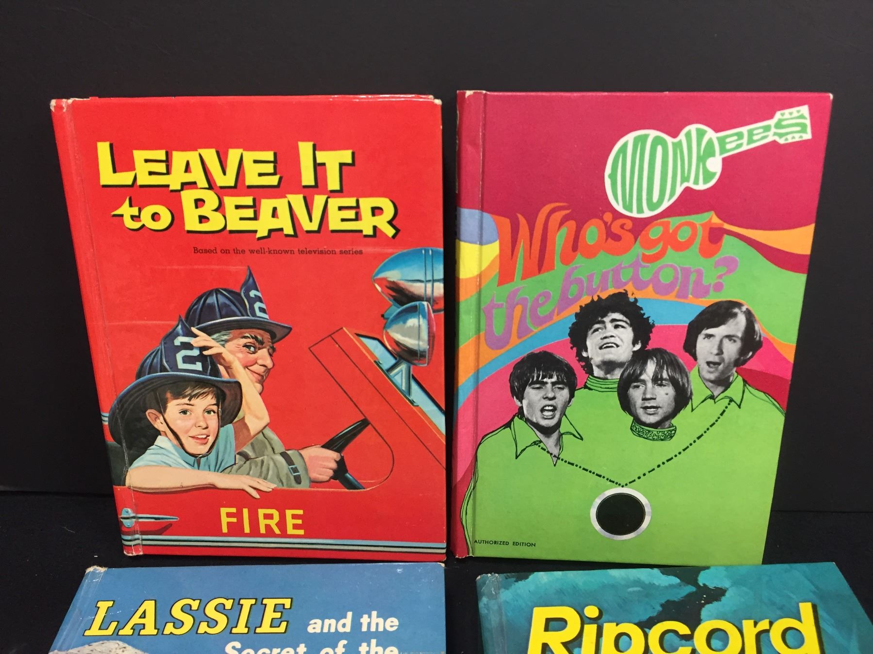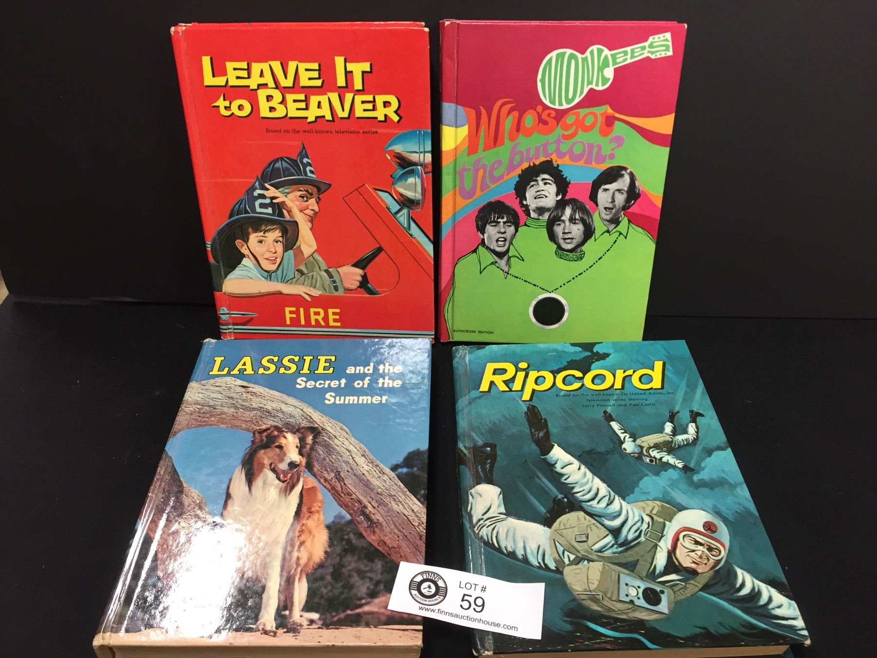 4 Vintage 1960's Hard Cover Books. Lassie, Ripcord, Leave It To Beaver, and Monkees All Based On TV Shows
