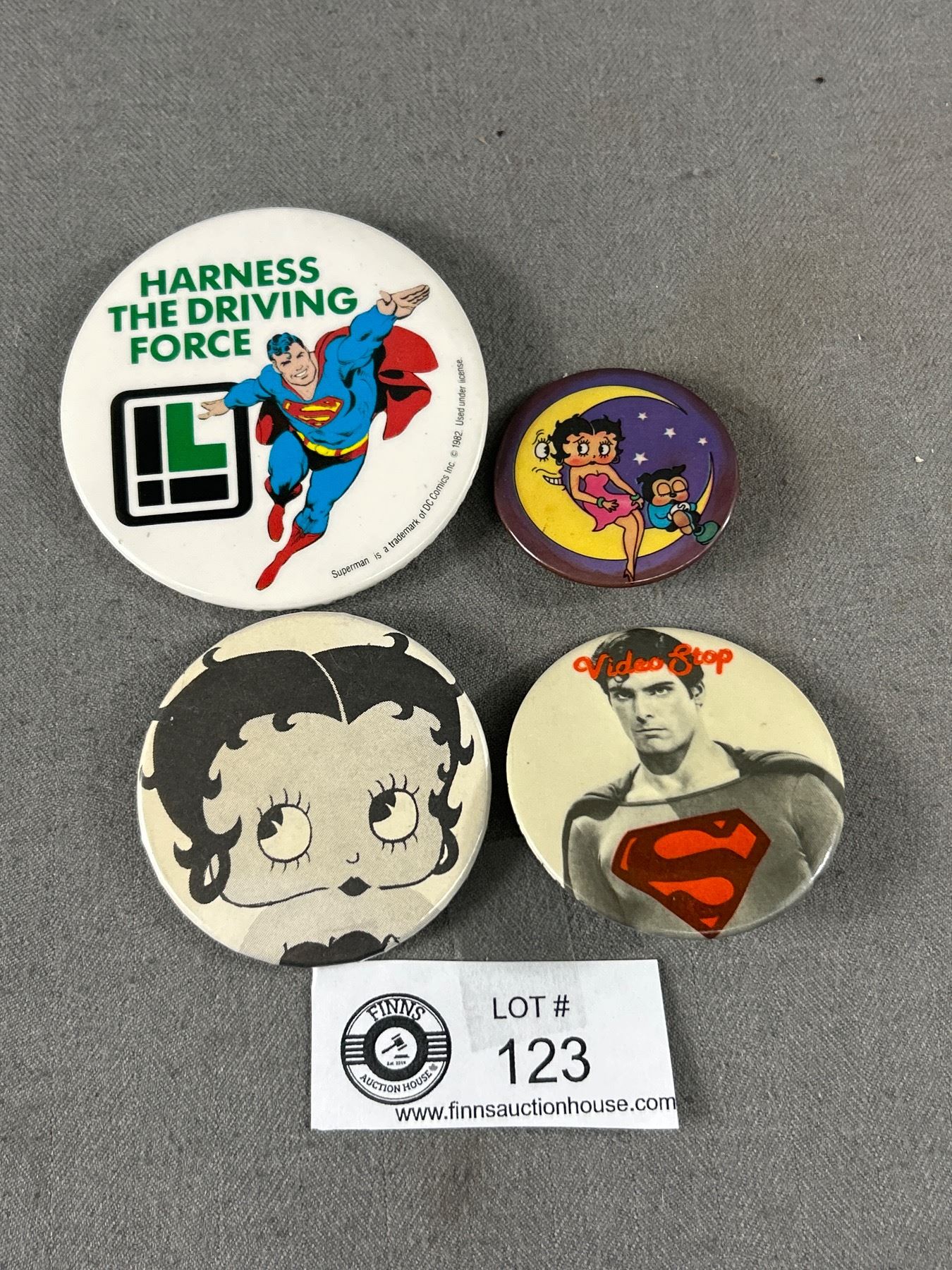 4 Vintage Badges/Pinbacks - 2 Betty Boop & 2 Superman