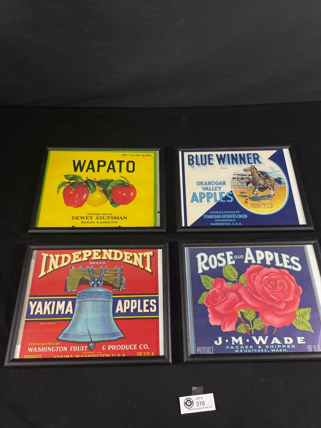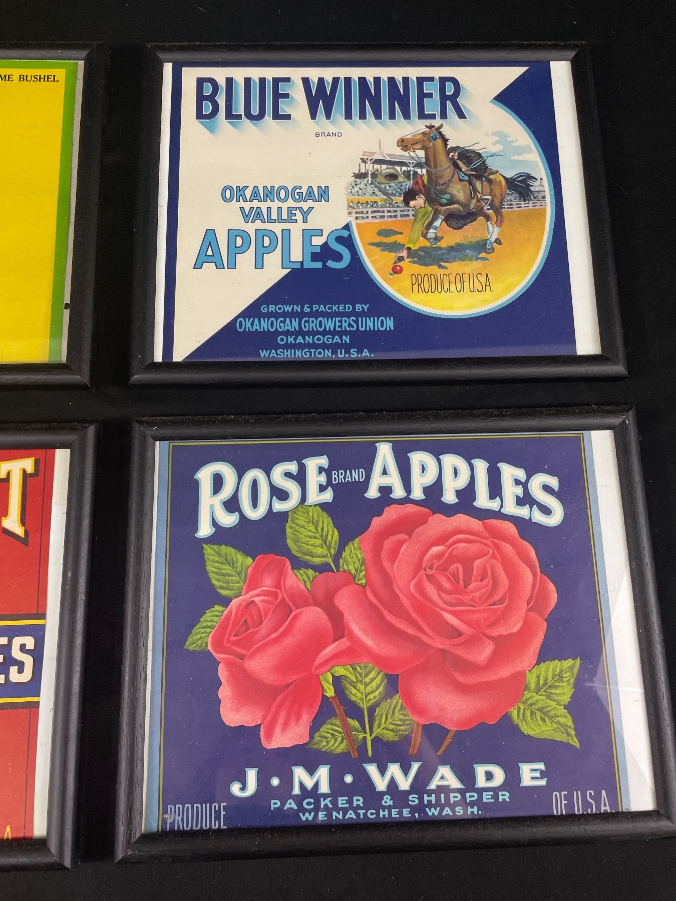 4 Vintage Framed Produce Labels. Approx.12" x 9 1/2"