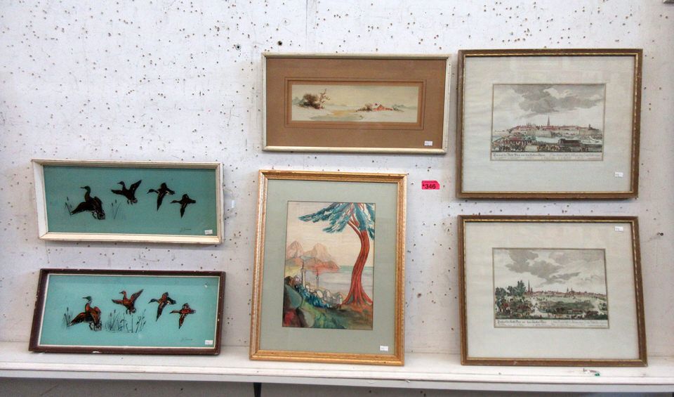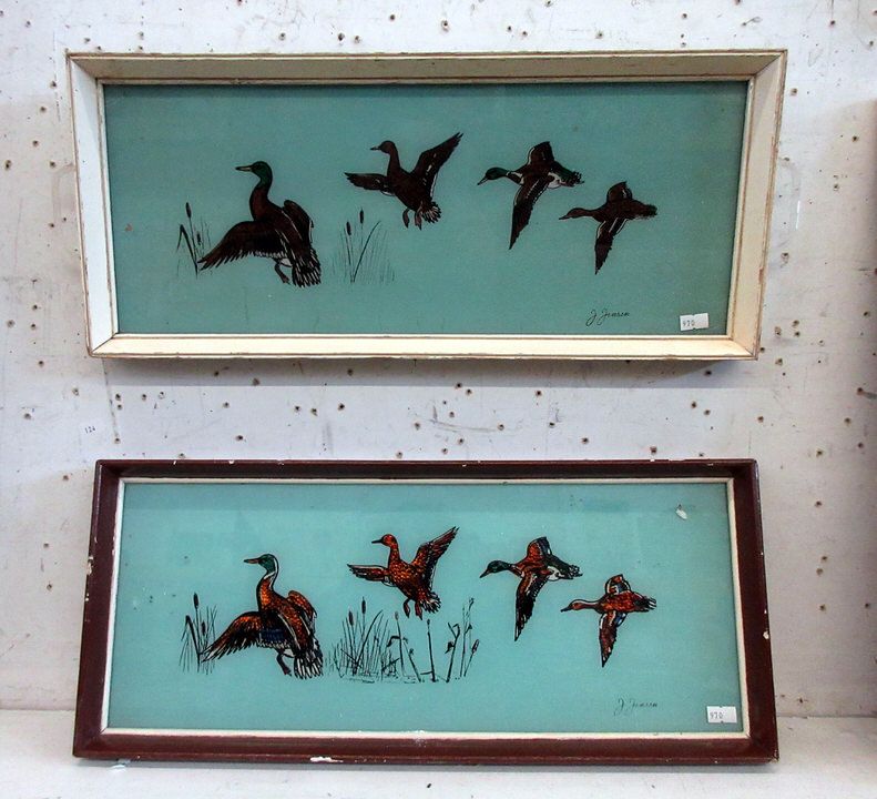 2 Reverse painted duck art: 9" x 21". Larger original watercolour: 19" x 21" framed. Hand tinted etchings: 16" x 20" framed.