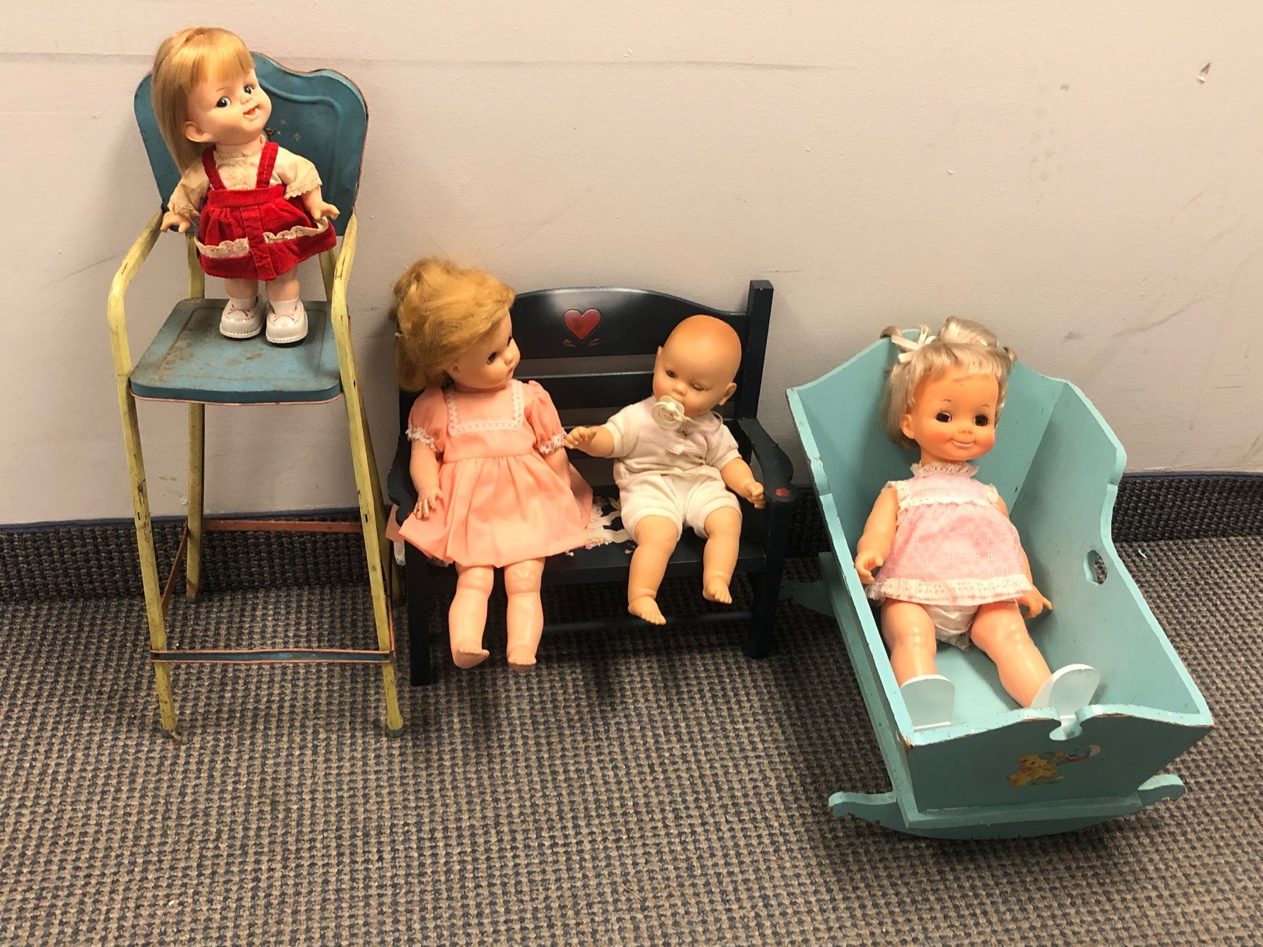 4 Vintage estate baby dolls w/ bench, chair & cradle