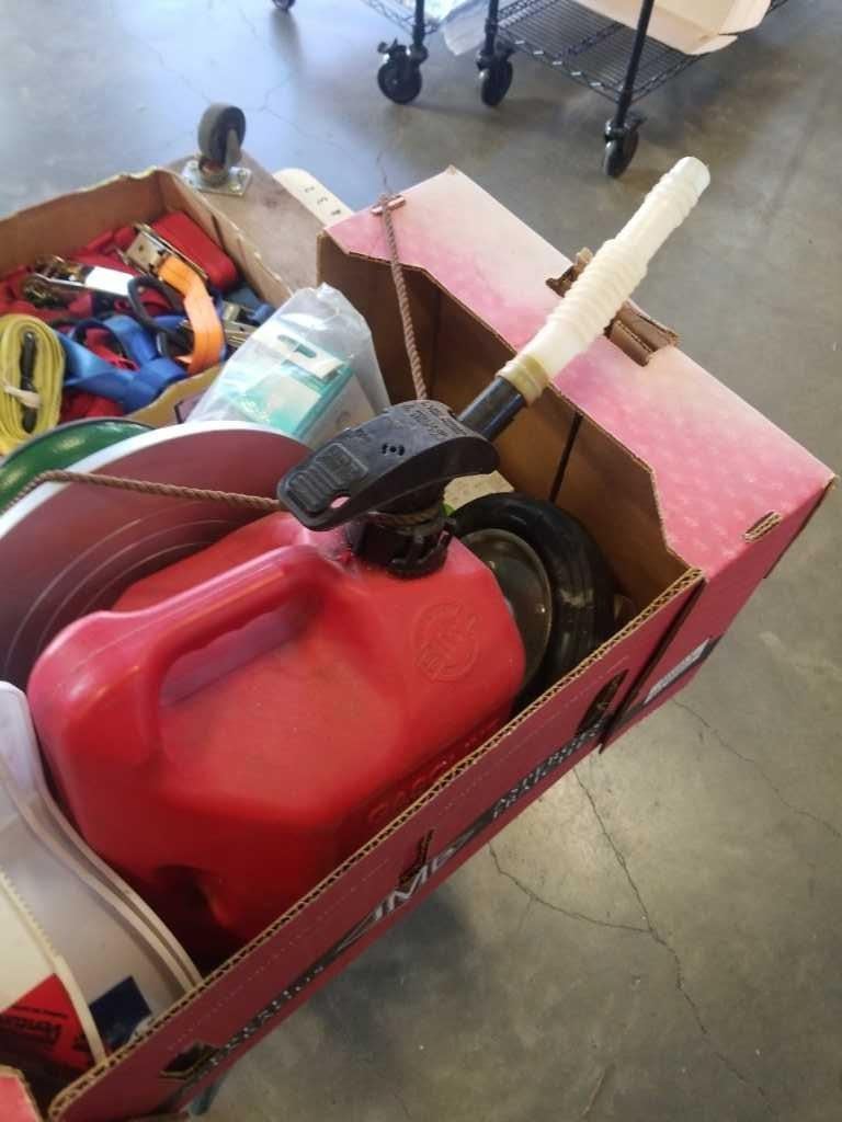 4 WHEEL FLOOR DOLLY, TRAY OR RATCHET STRAPS, AND BOX OF ASSORTED SHOP SUPPLY, BROOM HEADS, GAS CAN E