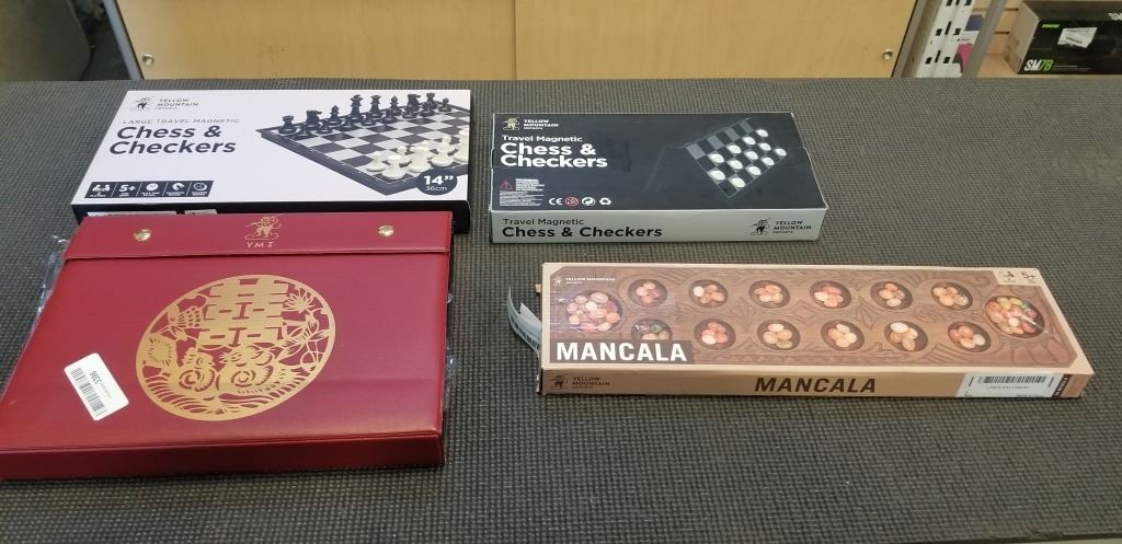 4 YELLOW MOUNTAIN GAMES INCLUDING MAJONG SET, 2 CHESS SETS ETC.