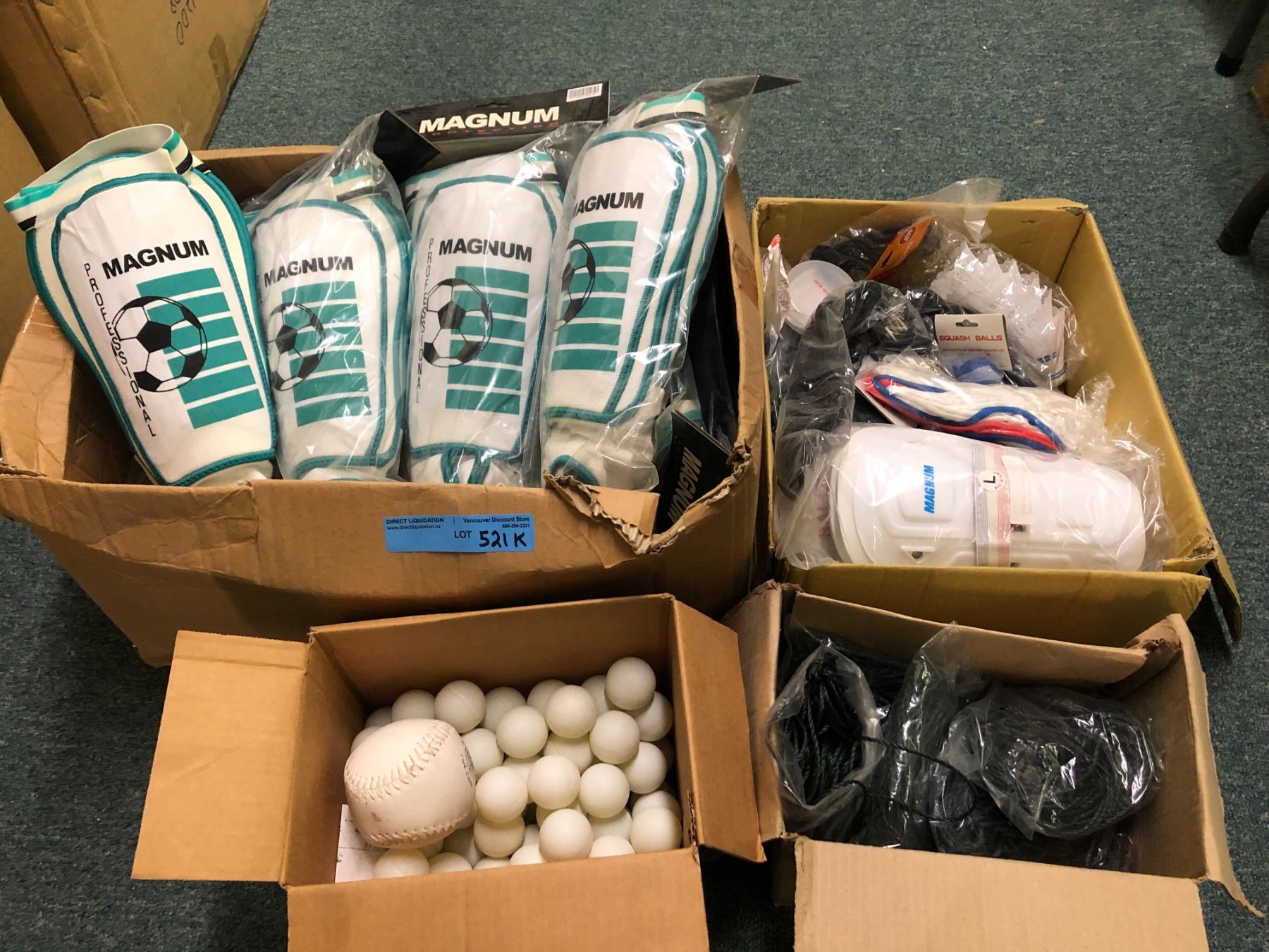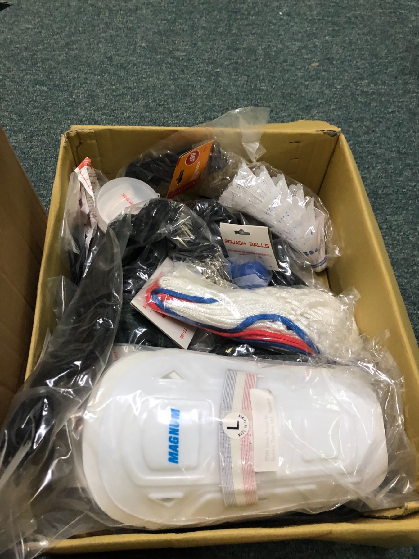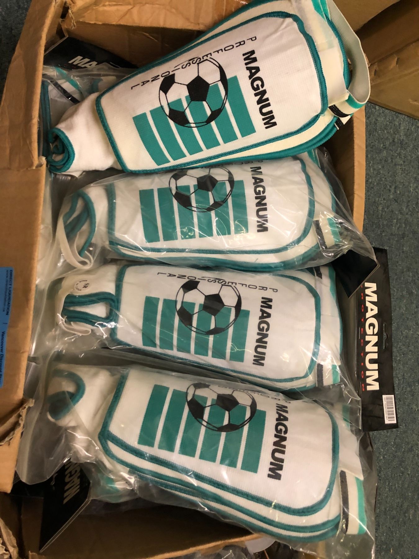 4 boxes “New” assorted sports accessories-lanyards/shin pads etc