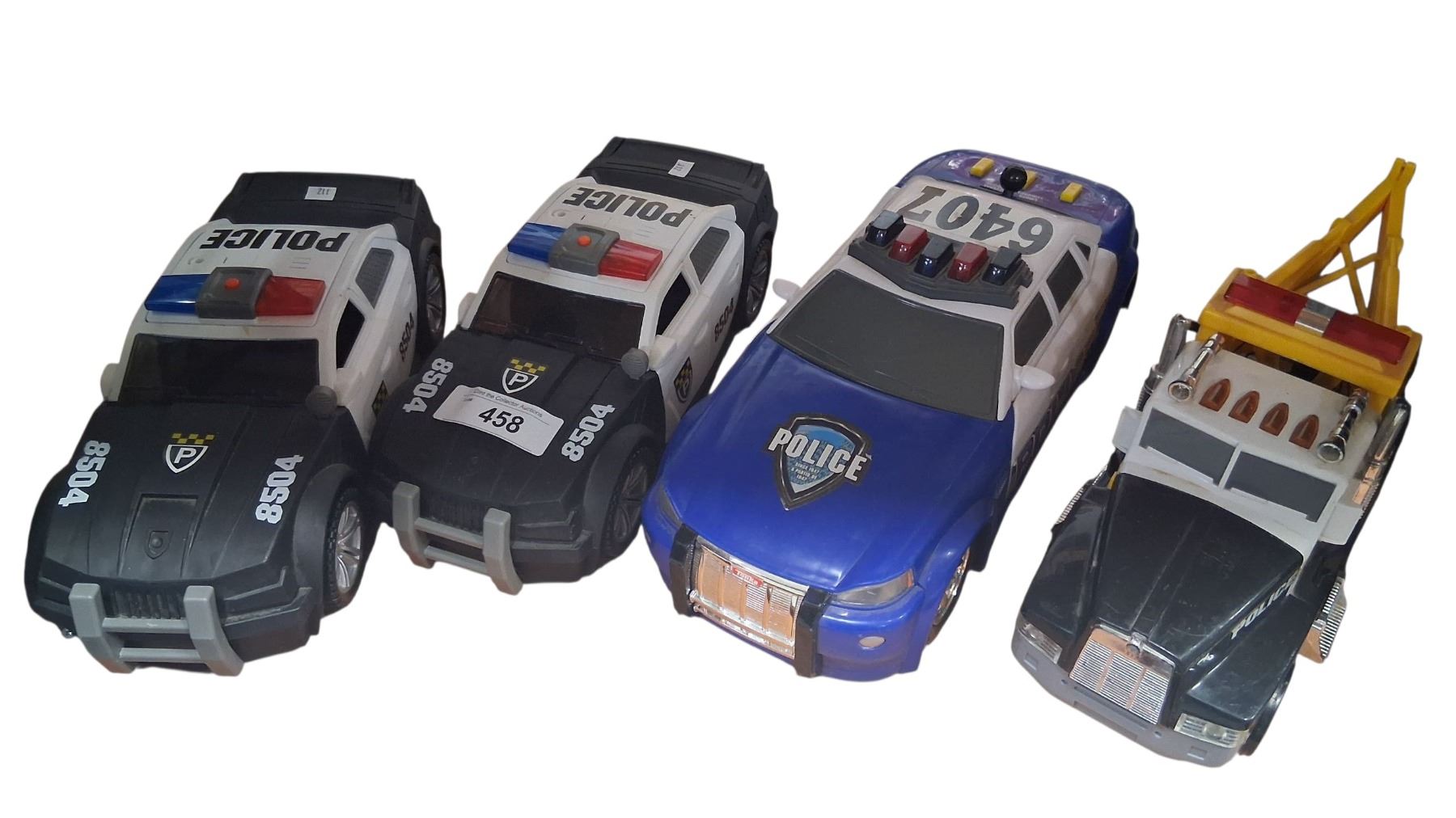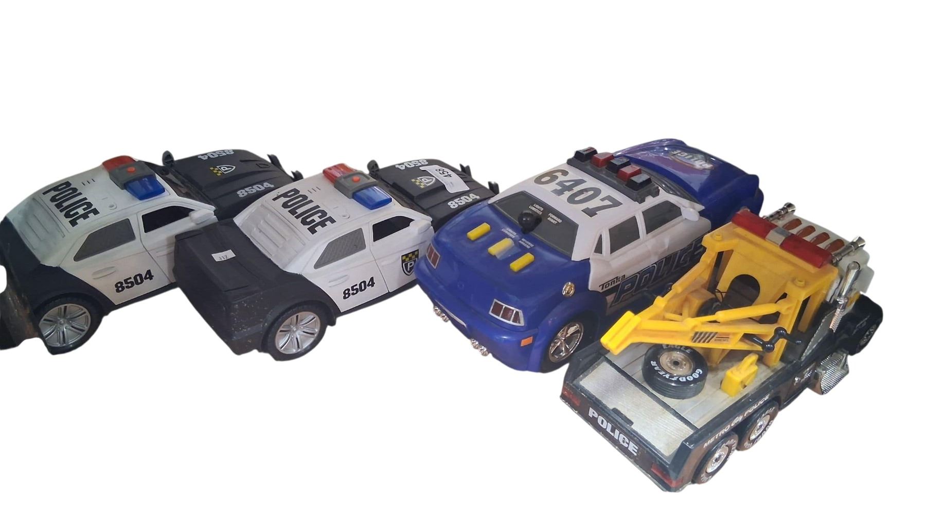 4 large Tonka police cars and tow truck. Working lights and sound, 13" each