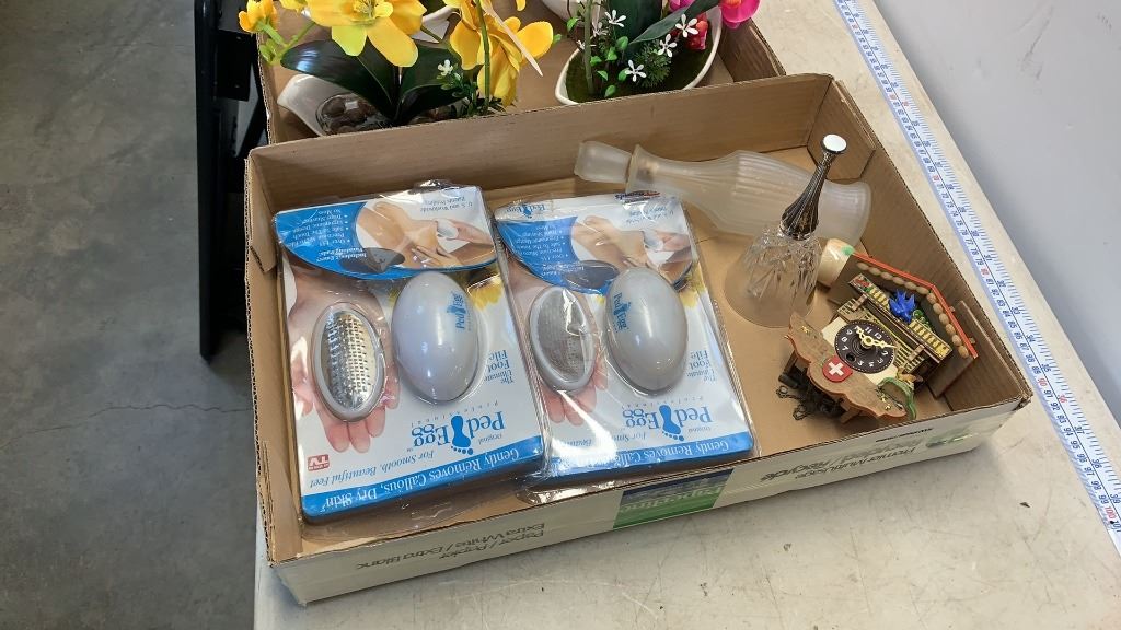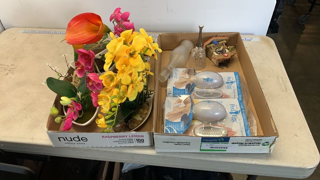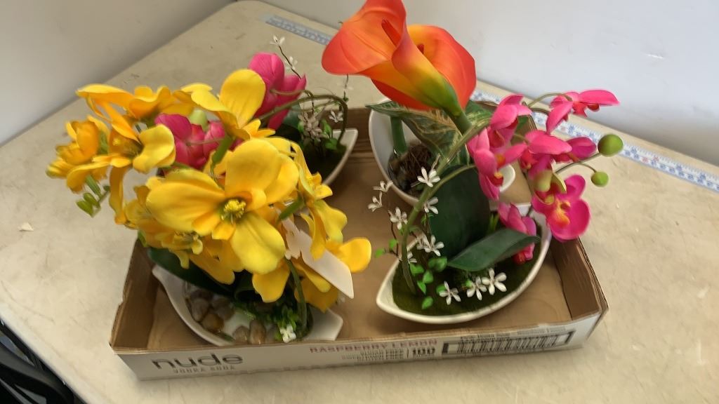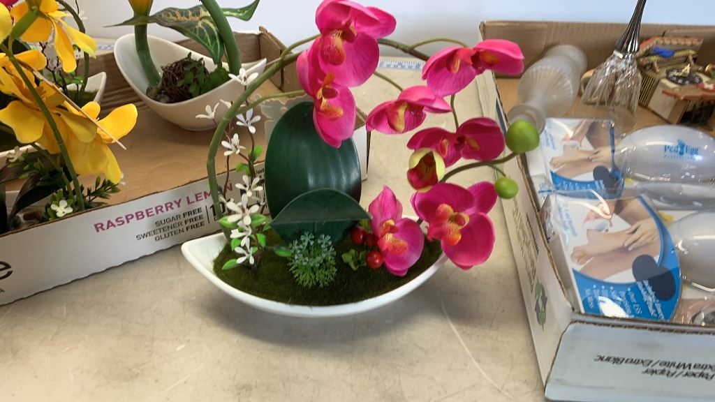 4 new artificial orchids with tray of collectibles and pedieggs