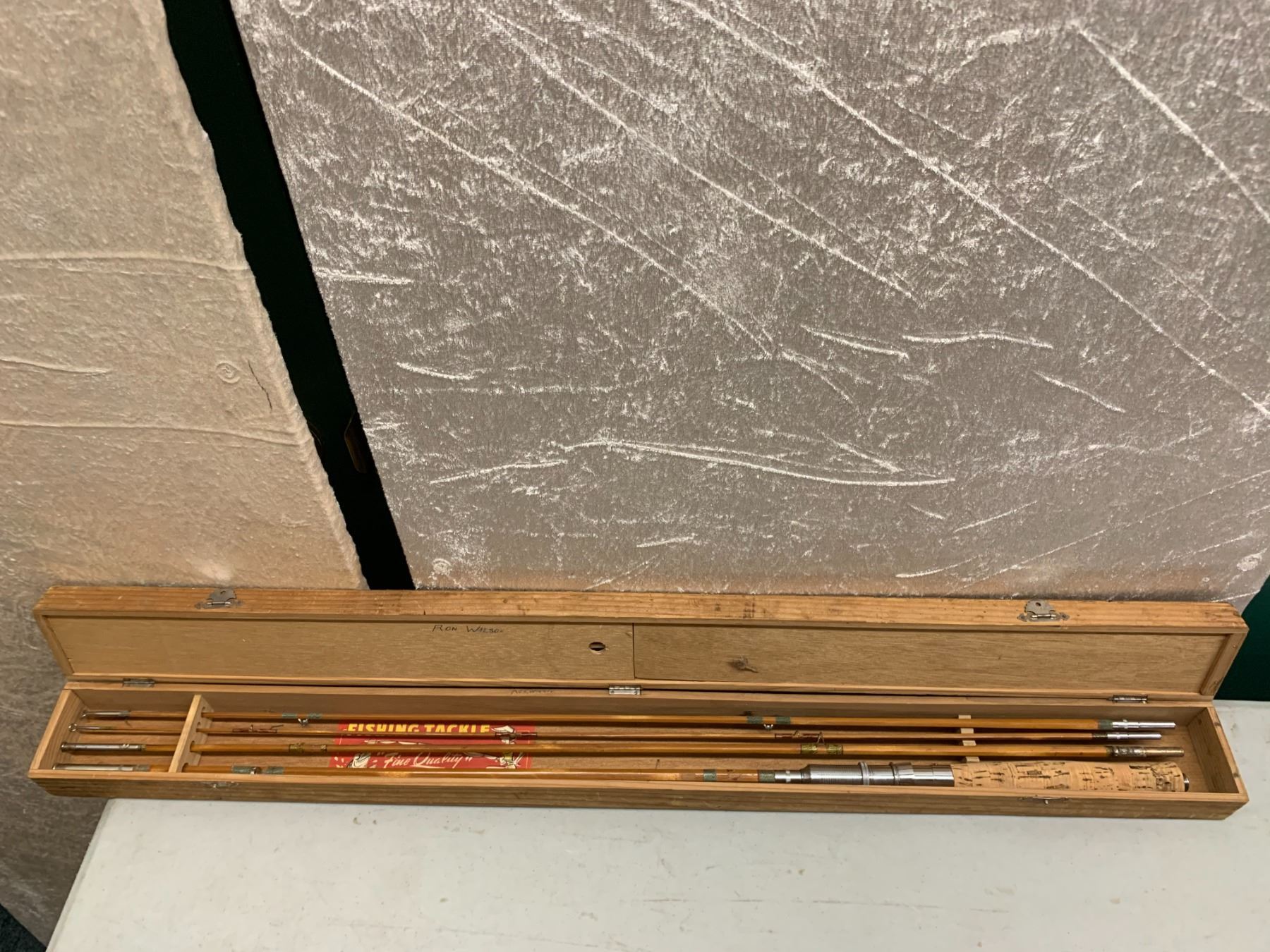 4 pc. antique split-cane fishing rod w/wooden case - needs some repair
