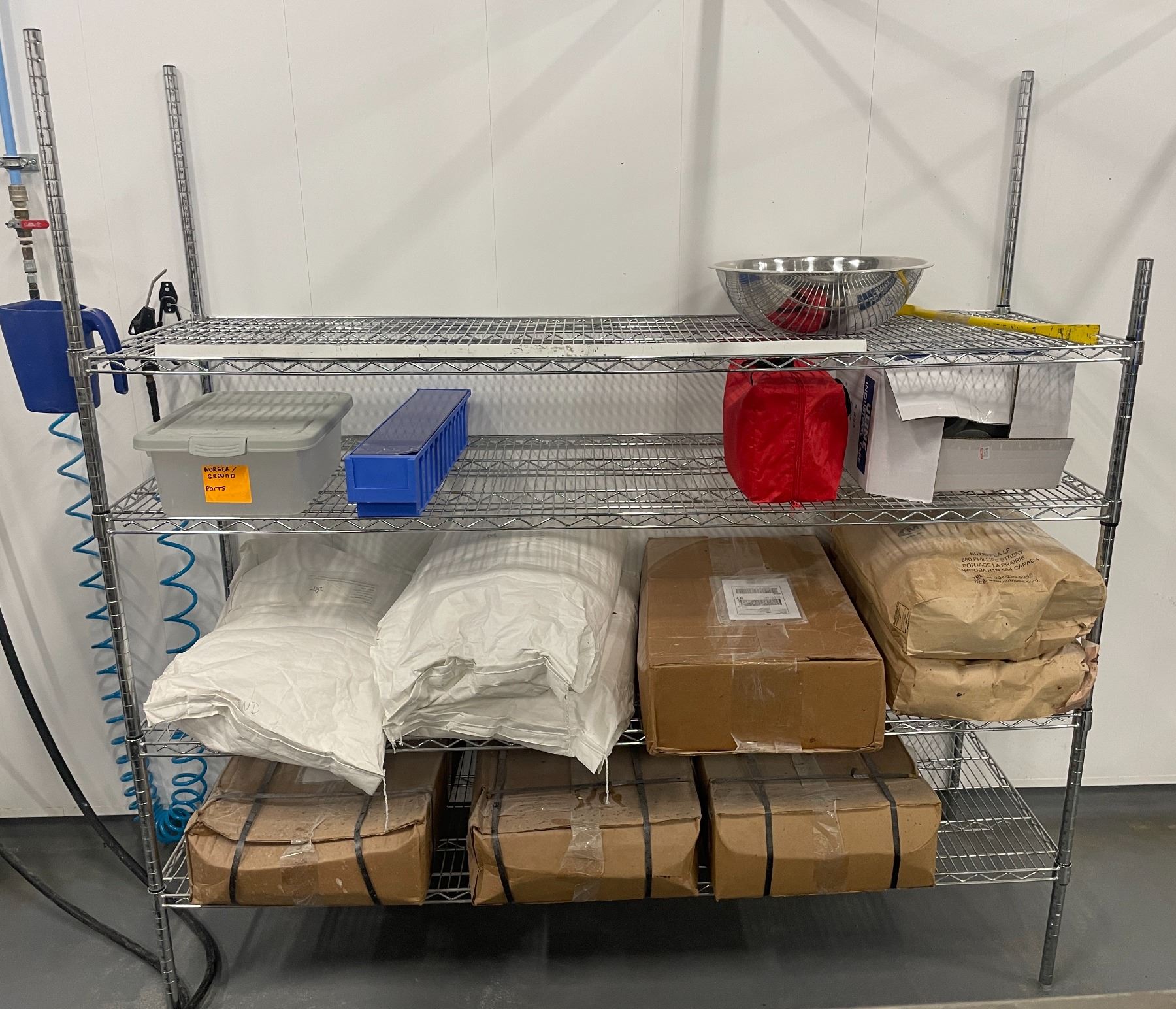 4 tier heavy-duty metal shelving rack with contents - tape guns/ Nutri Pea Pro Pulse Pea Protein 20kg bags/ Pea Protein Isolate 80% rack (approx. 71in wide x 24in depth x 6ft tall)