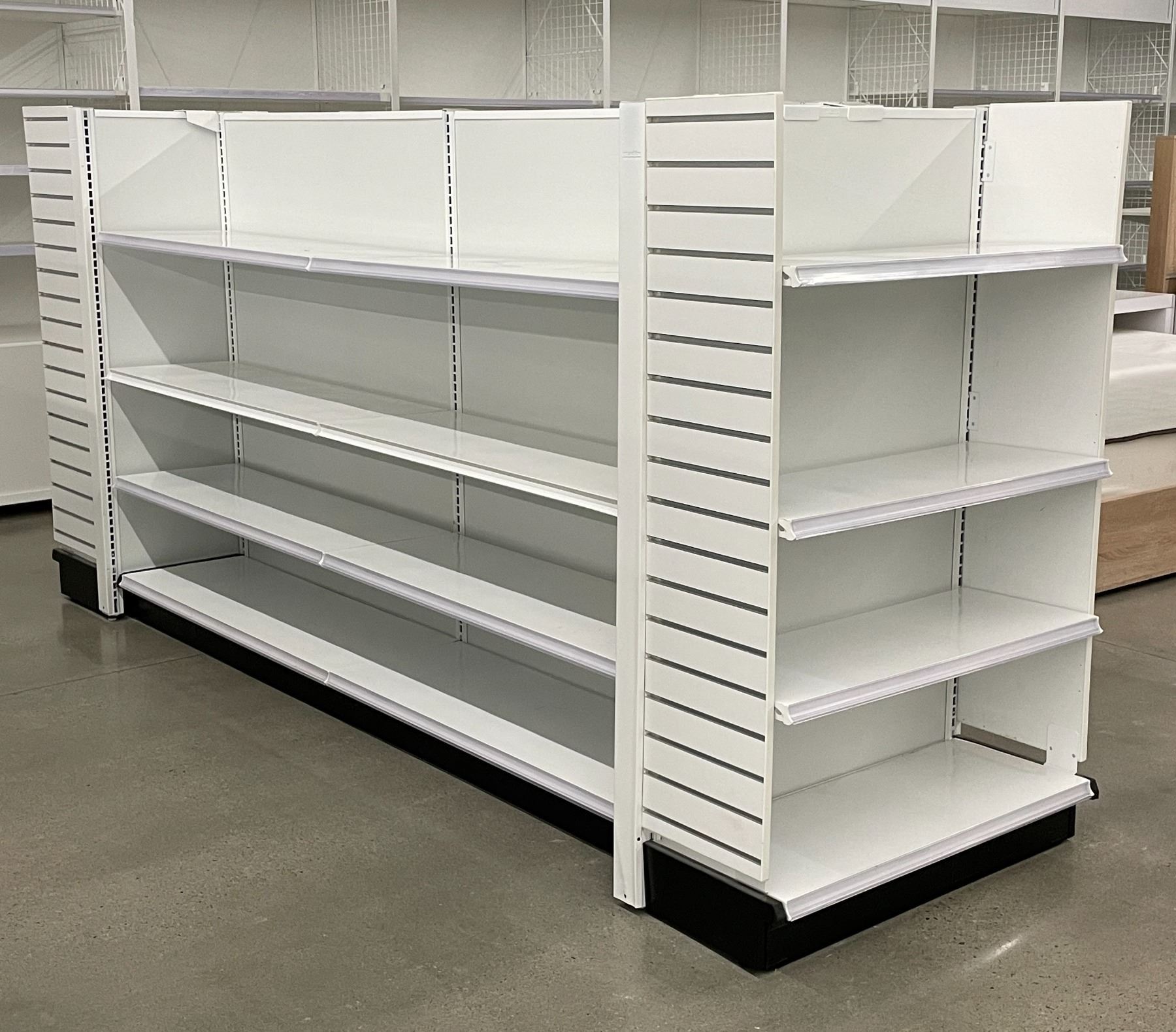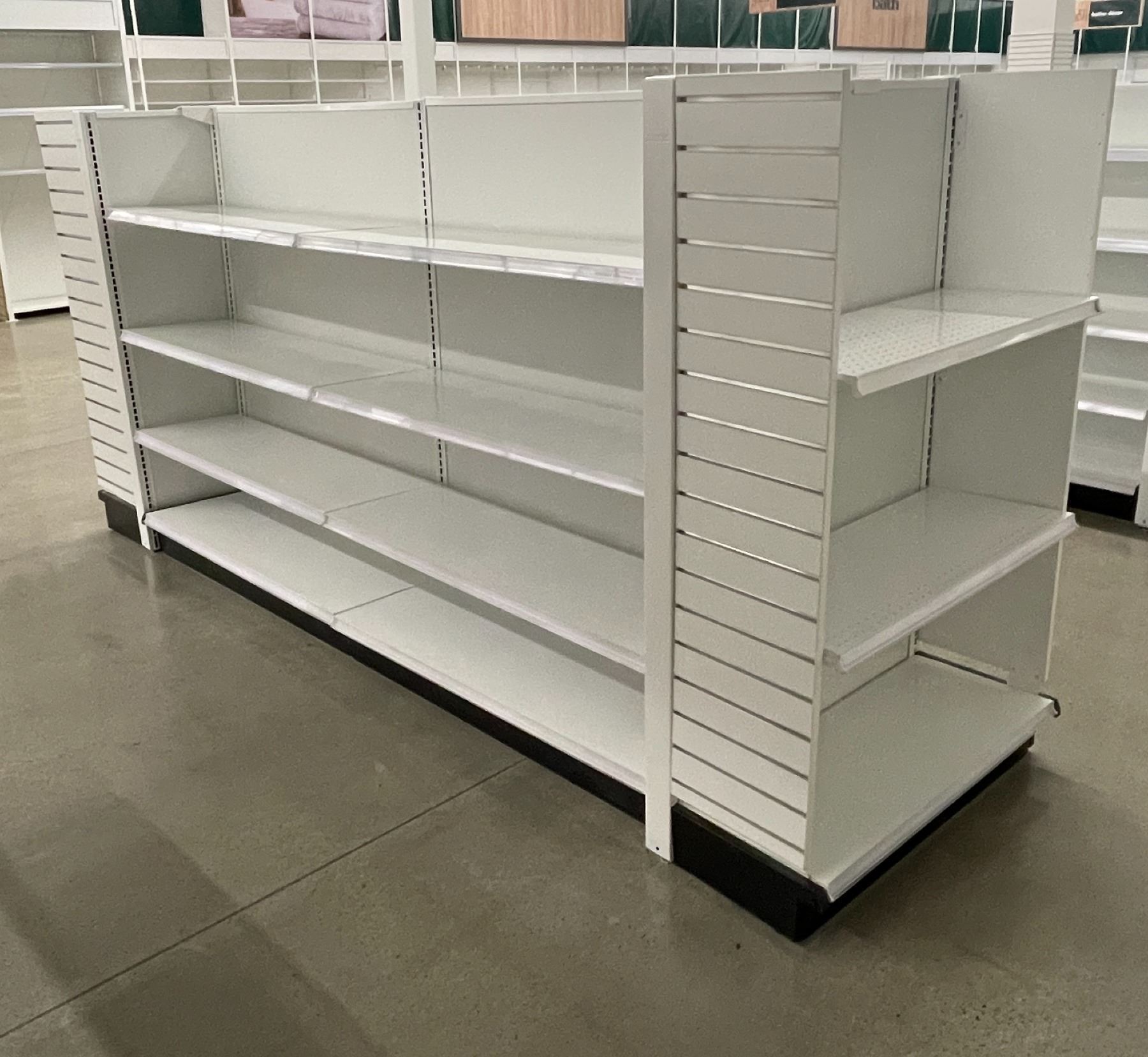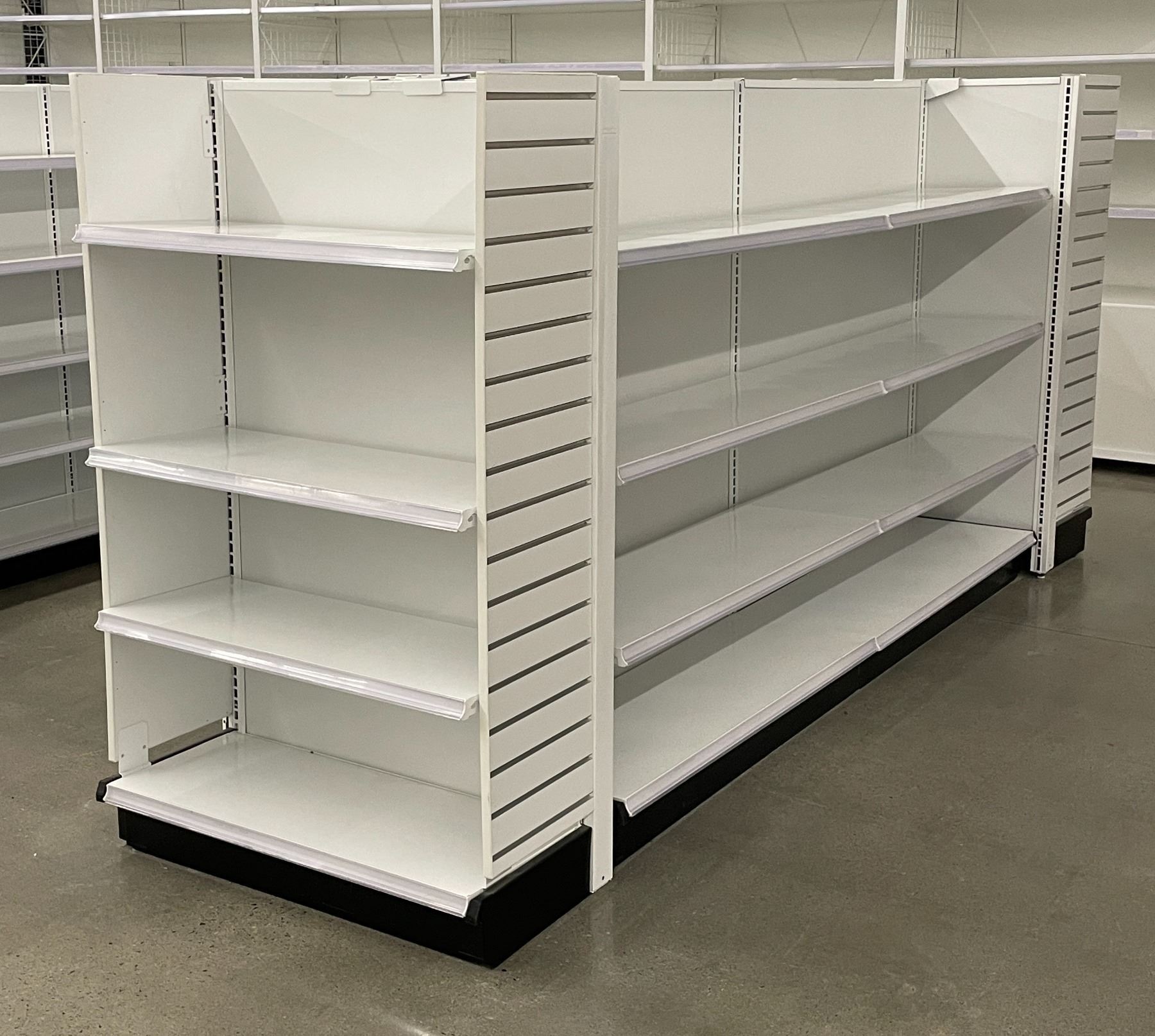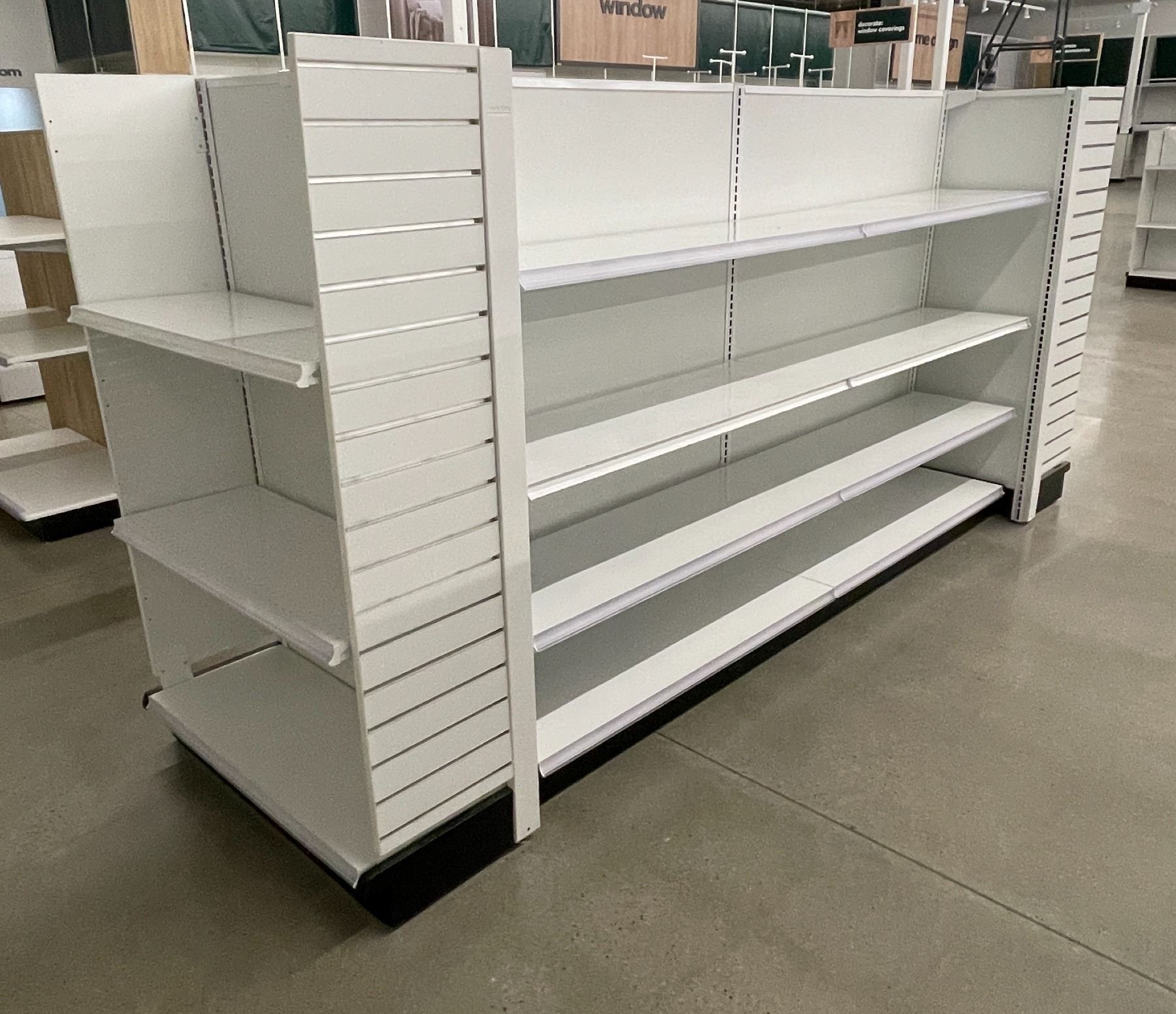 4 tier retail shelving double-sided gondola with end caps (approx. 132in W 61in H 38in D - excellent condition - Madix brand) BIDDERS ARE RESPONSIBLE FOR ALL COSTS ASSOCIATED WITH PICKUP OF THEIR LOTS INCLUDING BUT NOT LIMITED TO RENTAL OF EQUIPMENT, FORKLIFTS, LABOUR, TRUCKING, TOOLS ETC.