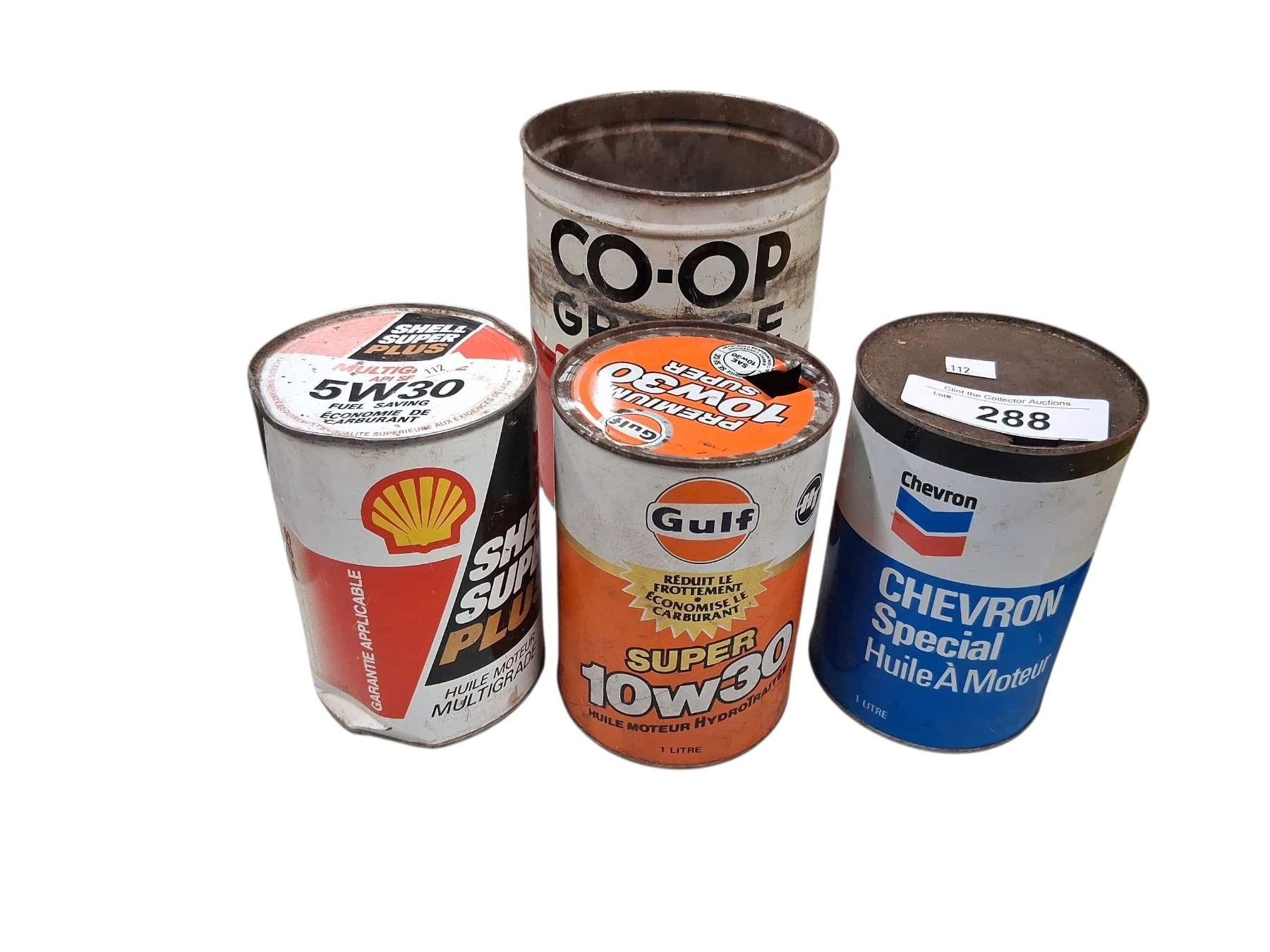 4 vintage oil cans, CO-OP, Chevron, Shell, Gulf