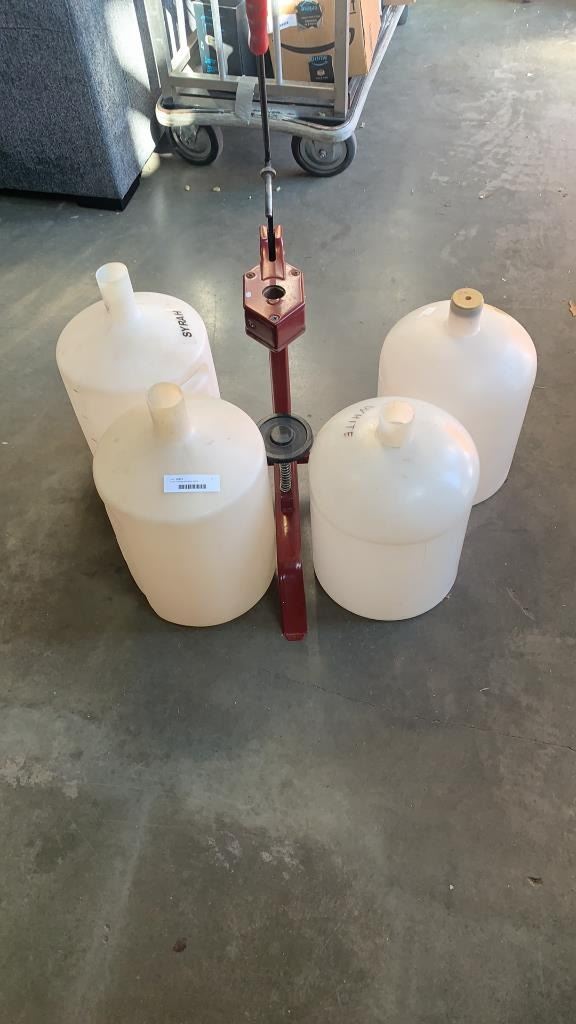 4 wine carboys and wine corker