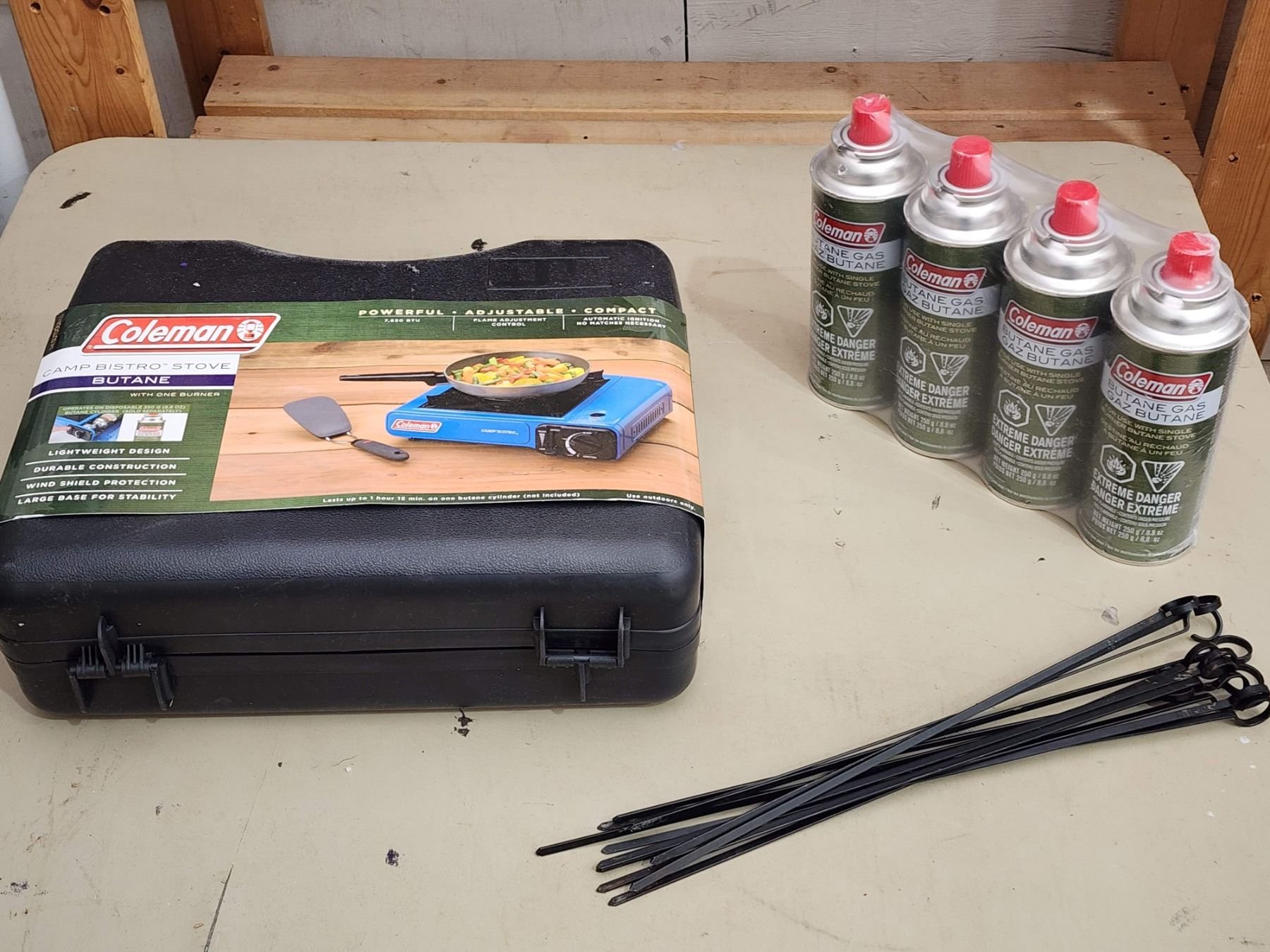 COLEMAN BUTANE CAMP STOVE WITH FOUR CANISTERS OF BUTANE AND METAL STAKES