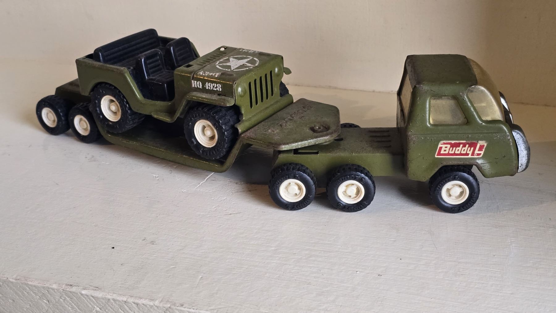 VINTAGE BUDDY L MILITARY TRUCK, TRAILER AND JEEP.
