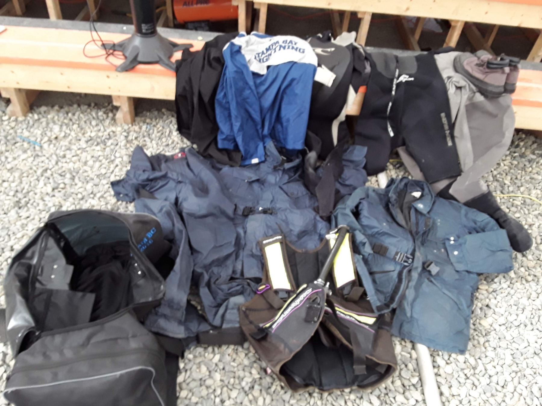 Lot of Cold weather gear, Scuba harness, Hip waders, wet suits and more -- Untested -- 17% Buyer Fee. Payment Processed through Live Auction World ( Visa or Master Card ) pick up Saturday, or Tuesday