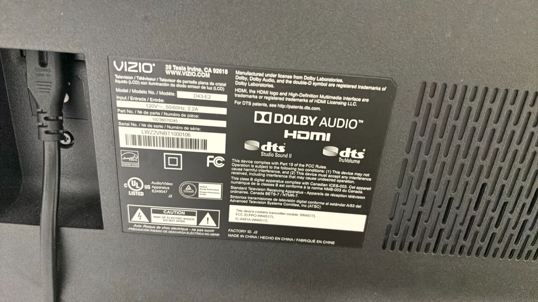 43  VIZIO TV *TESTED WORKING/ NO POWER CORD/ NO REMOTE*