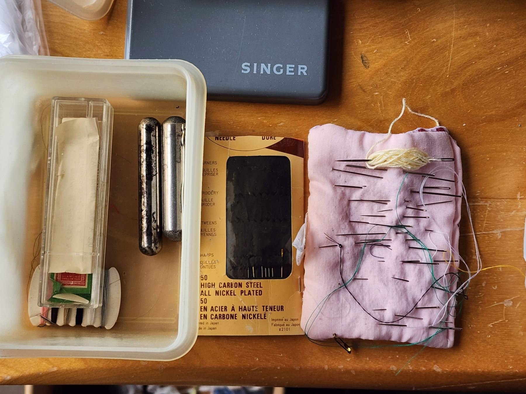 SEWING MACHINE AND FULLY LOADED DESK FULL OF SEWING SUPPLIES