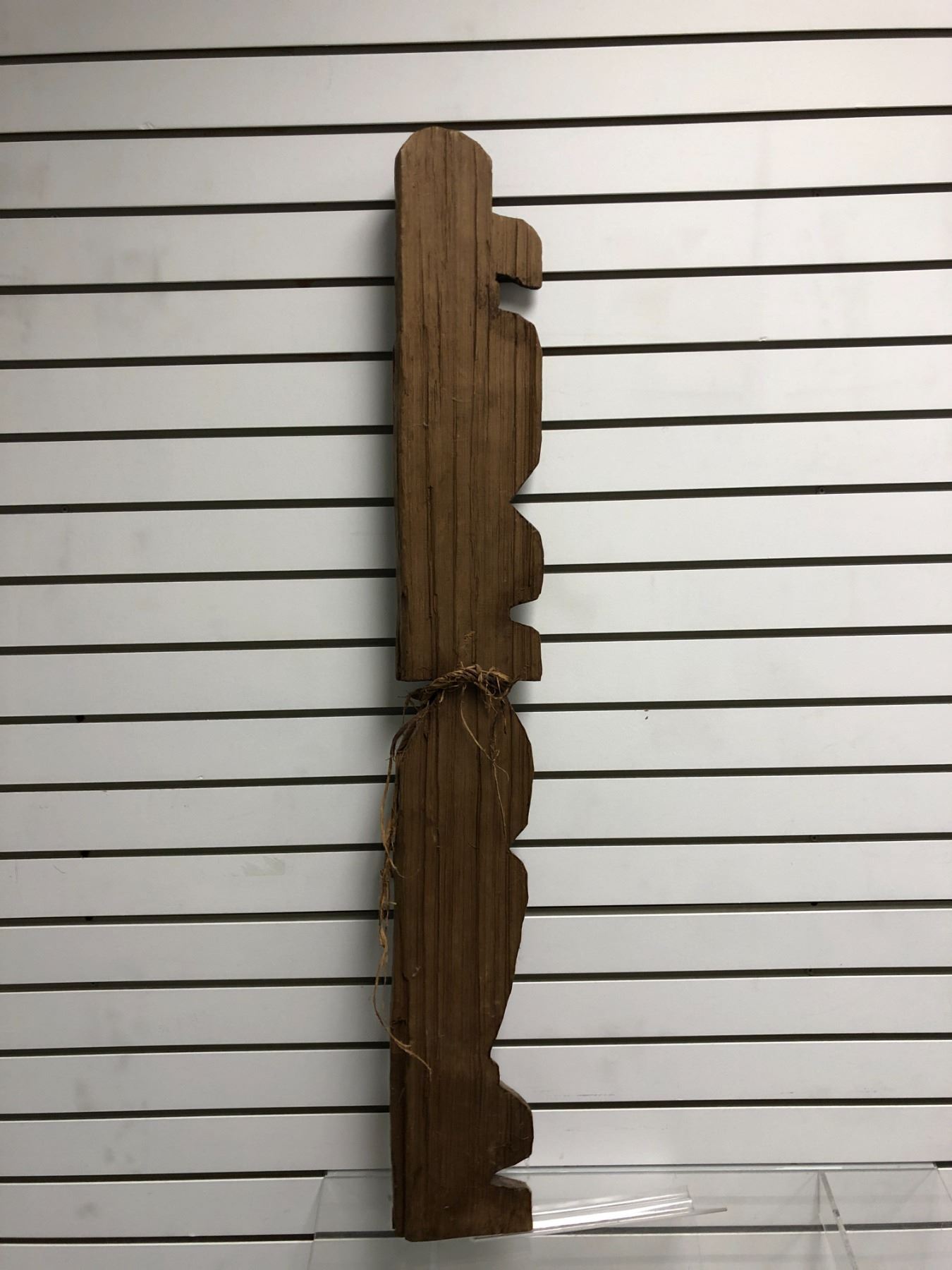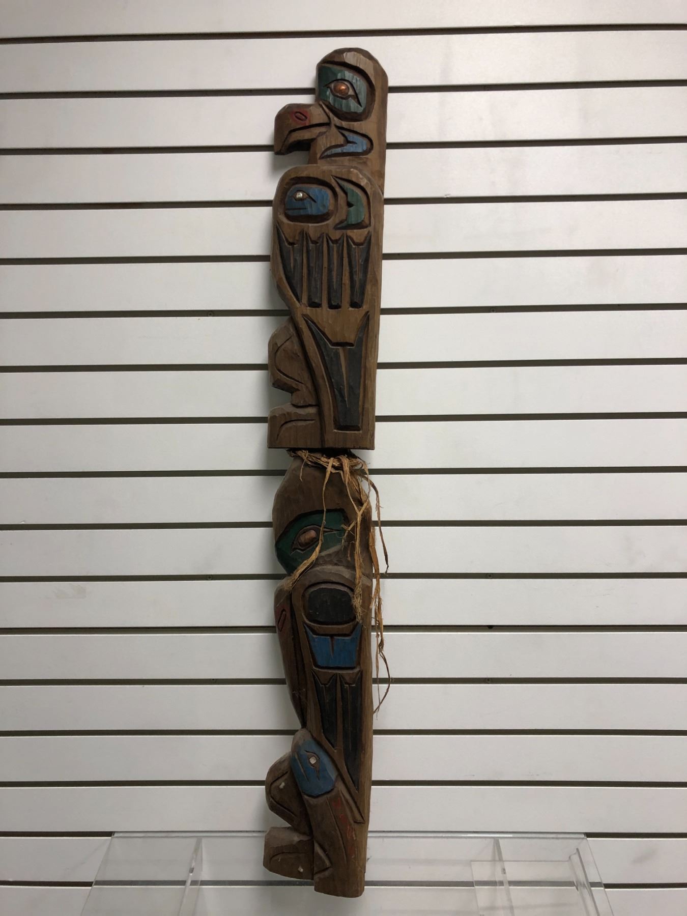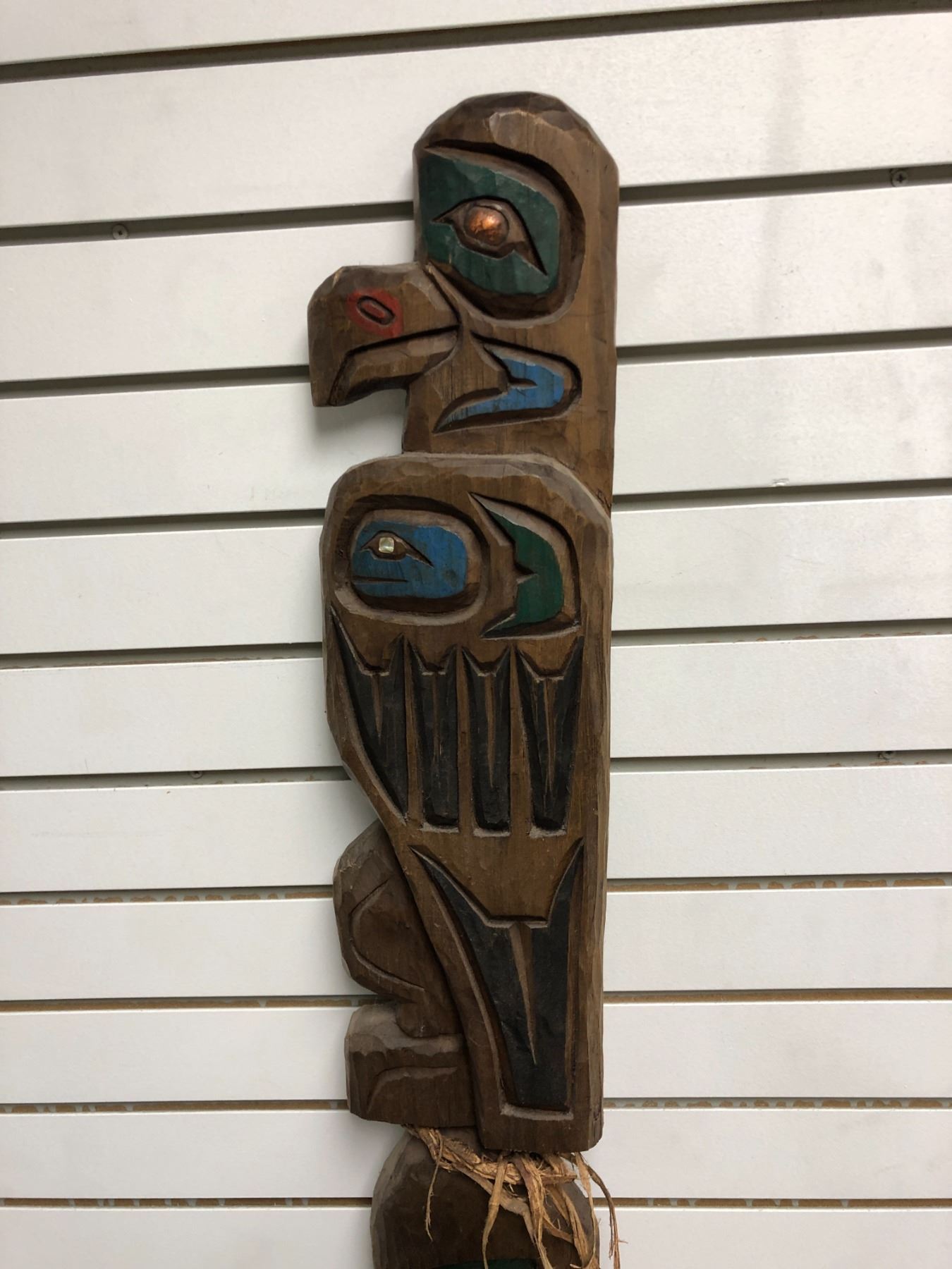 44 1/2in West Coast First Nations cedar carving "Raven & Salmon" w/ copper & abalone eyes (unsigned)