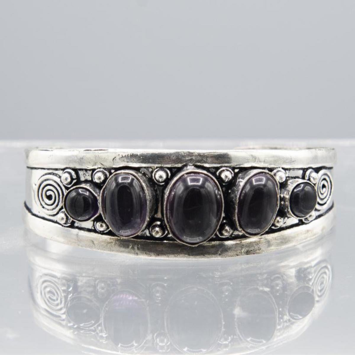 GORGEOUS 44 CT NATURAL AMETHYST CUFF BANGLE BRACLET.MOUNTED IN ELABRATELY DESIGNED .925 STERLING SILVER OVERLAY.TOTAL GRAM WEIGHT IS 34.9 GRAMS. . ADJUSTABLE SO WILL FIT MOST EVERYBODY.