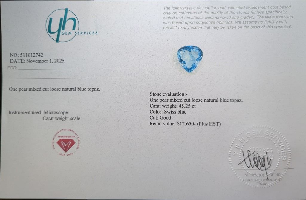45.25 CT CERTIFIED ROYAL BLUE TOPAZ GEMSTONE ($12,650 APPRAISAL)