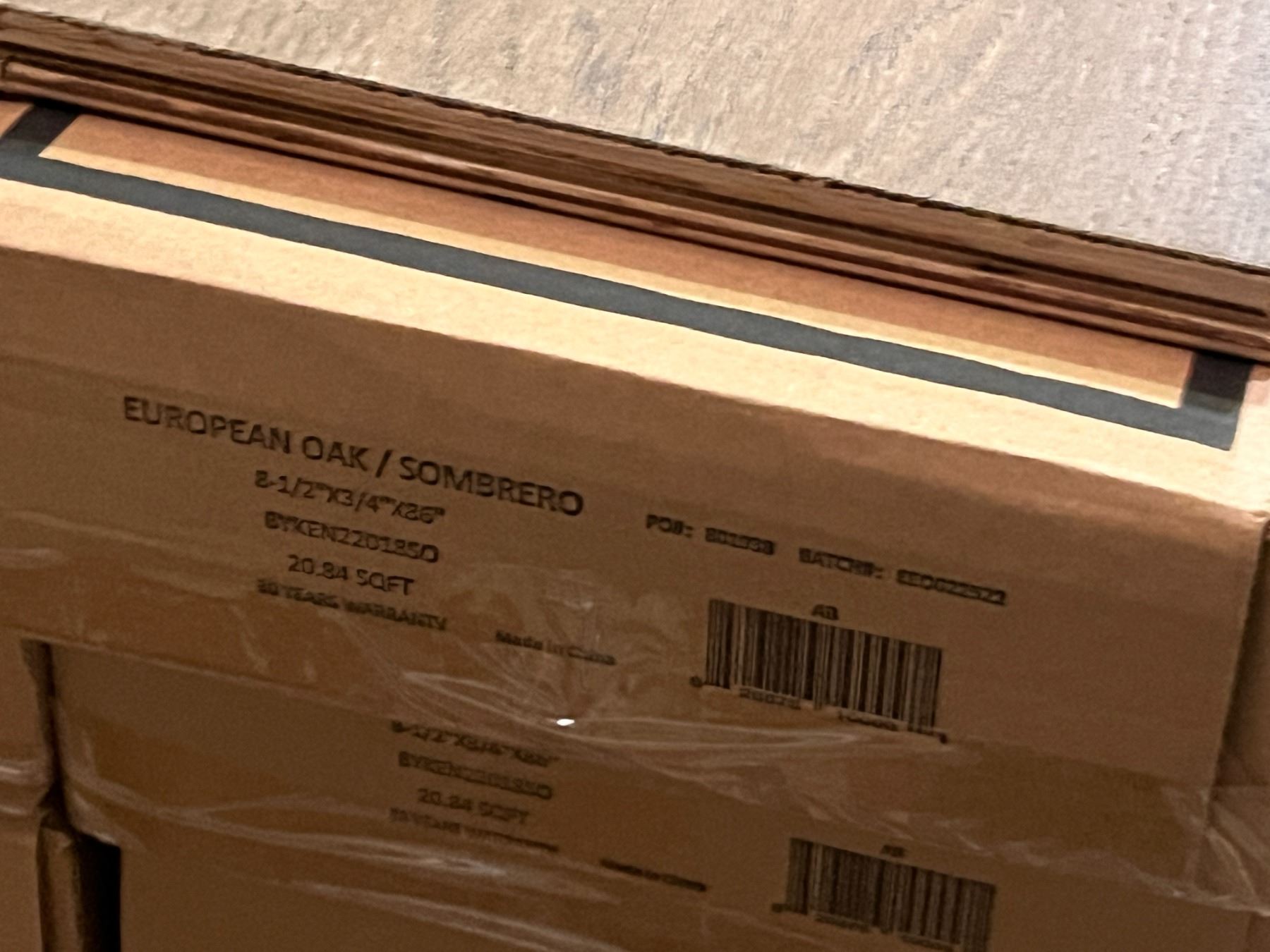 45 boxes (937.8 sq. ft.) of European Oak/ Sombrero Engineered Hardwood Flooring - 3/4" thick pressure fit 8 1/2in wide plank, 20.84 square feet per box.