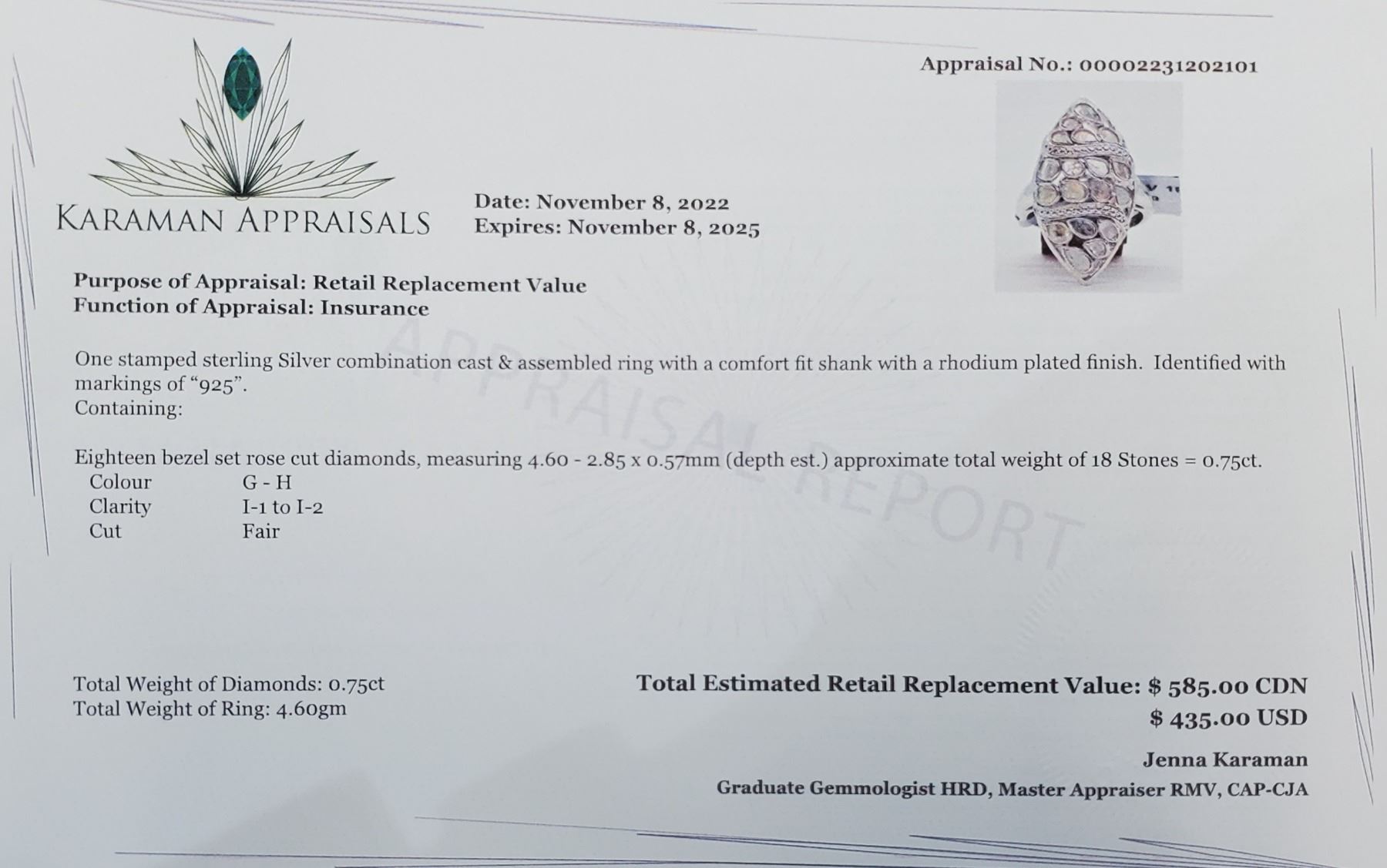Silver Diamond (0.75ct) Rhodium Plated Ring (~weight 4.55g), Suggested Retail Value $460