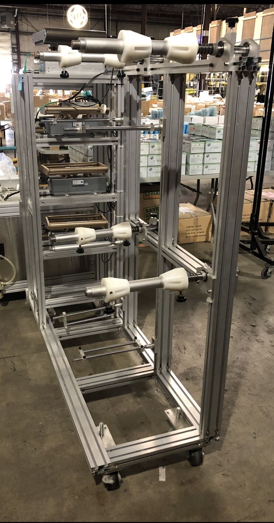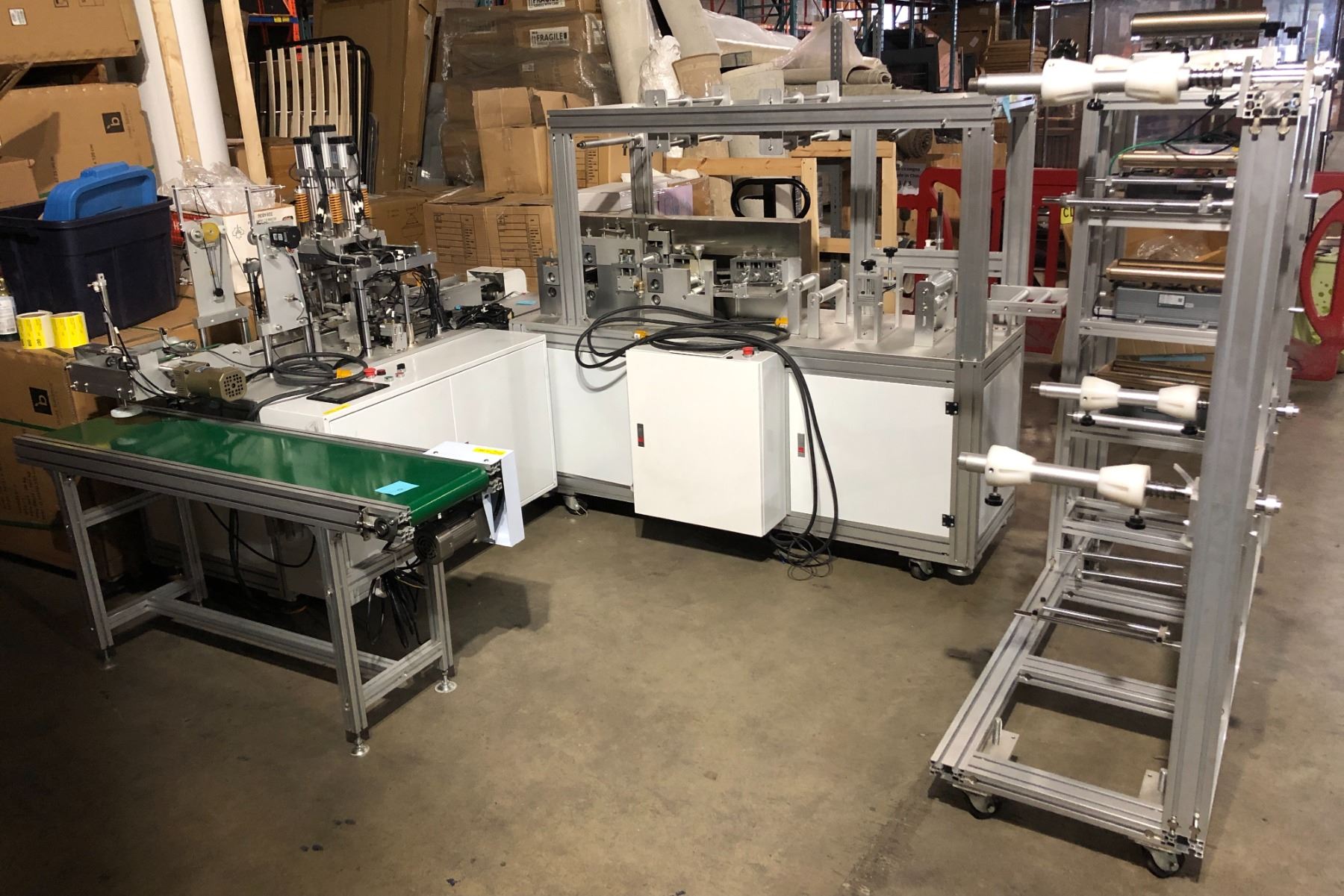 4pc Commercial Mask Production System - includes mask making machine/ mask correction machine for mask layering/ mask ear loop machine (produces 160 masks per minute)/ approx. 5ft conveyor (all equipment like new from 2020-2021) - components includes programmable controller/ motors/ control panels/ intelligent digital ultrasonic generators/ Arise W300 web guiding system/ PS-400S photronic edge sensors etc. (all equipment on wheels, easy removal)