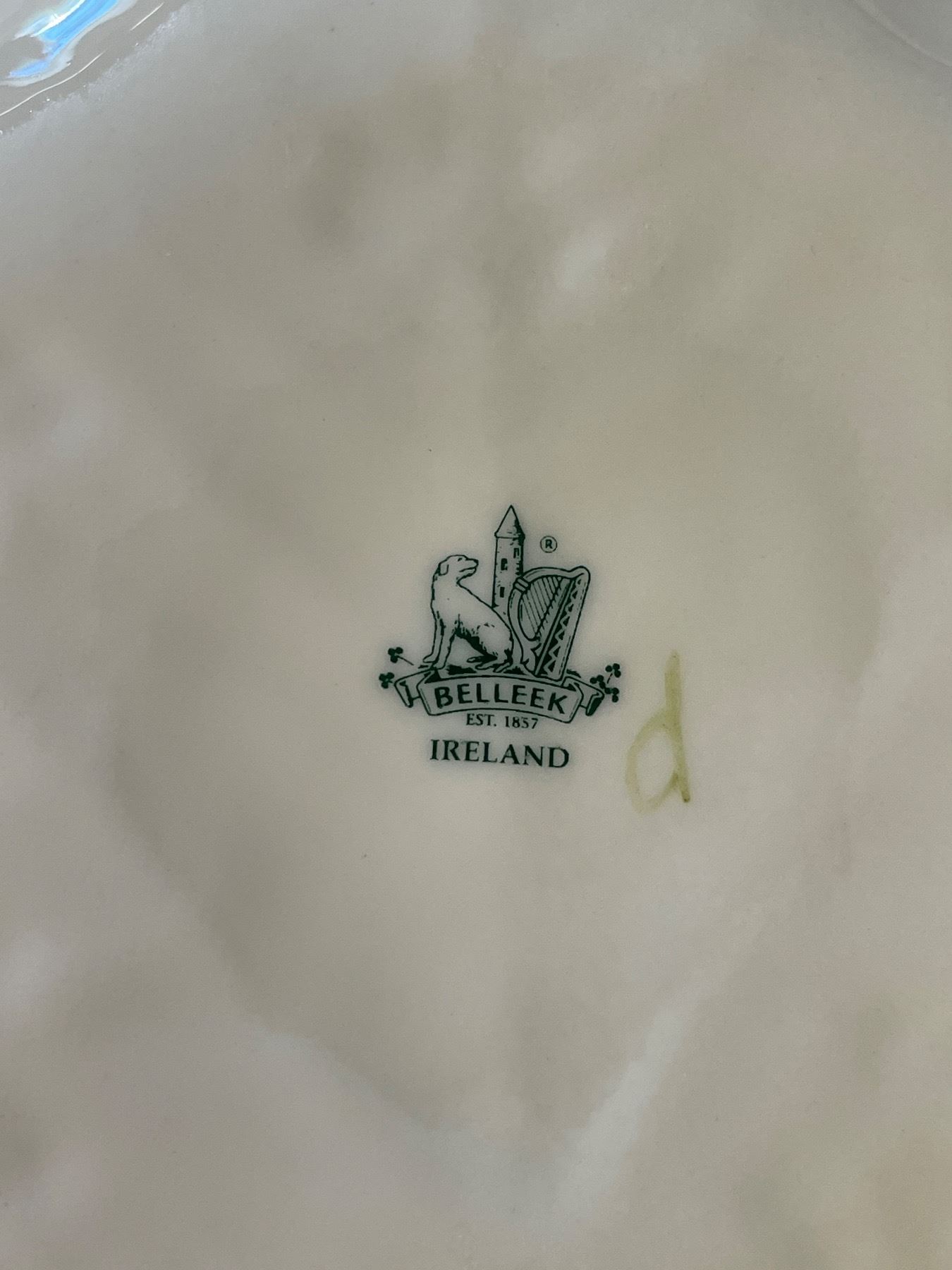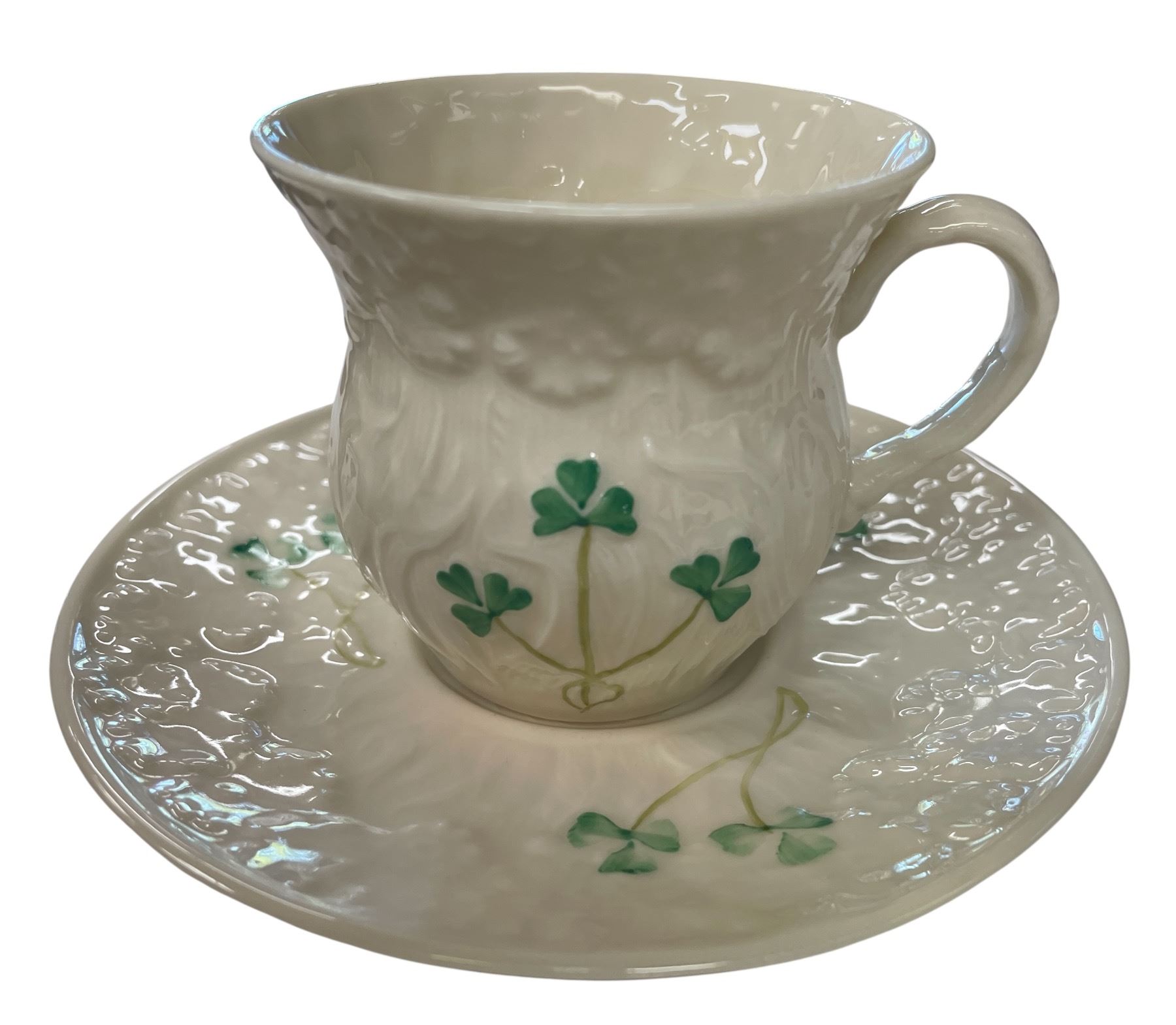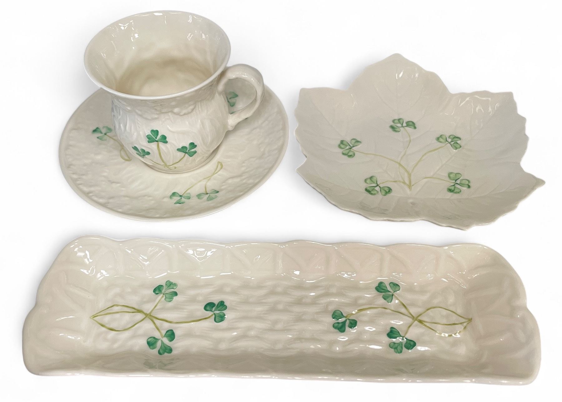 4x Vintage Belleek Shamrock Pieces: Cup & Saucer + 2 Plates
