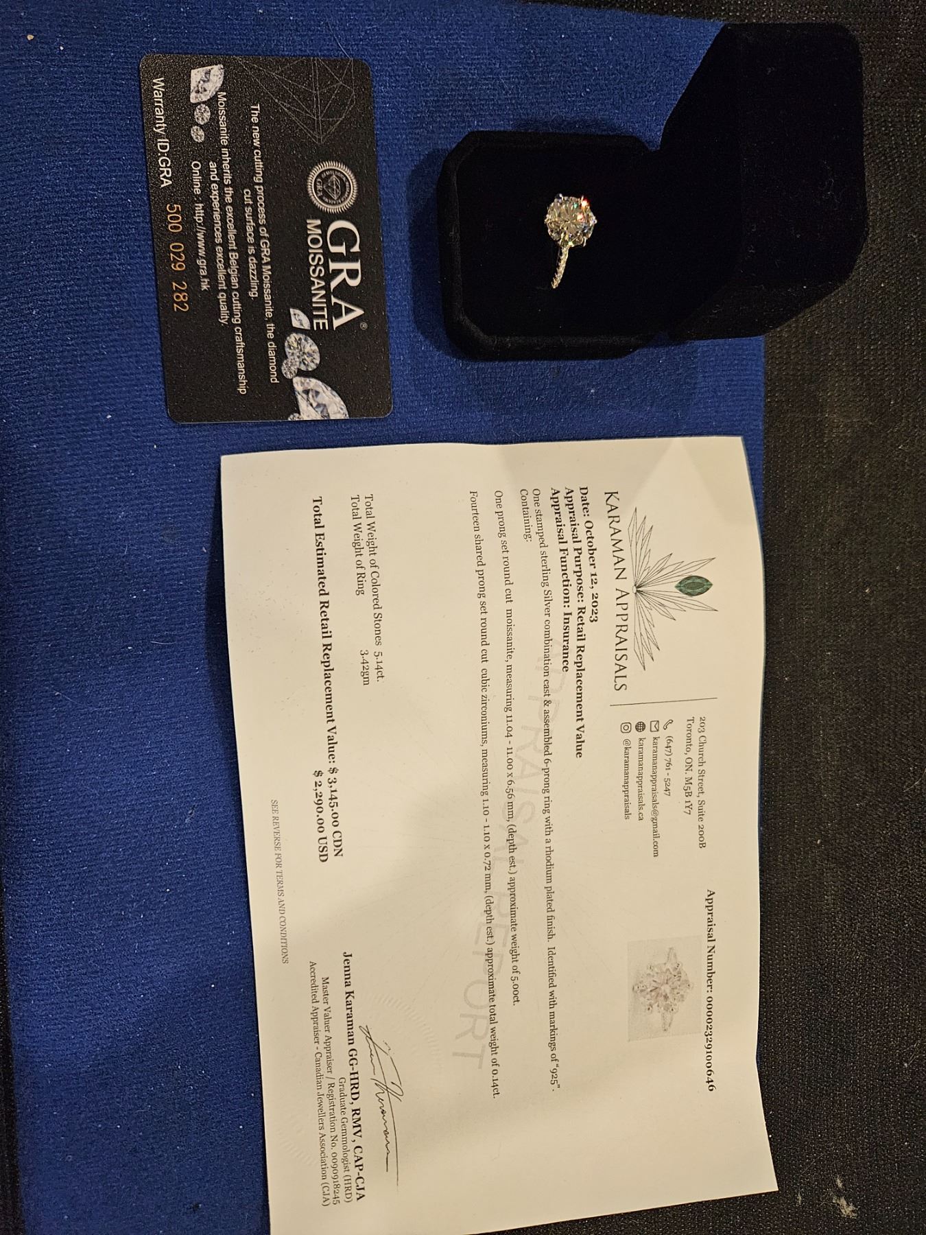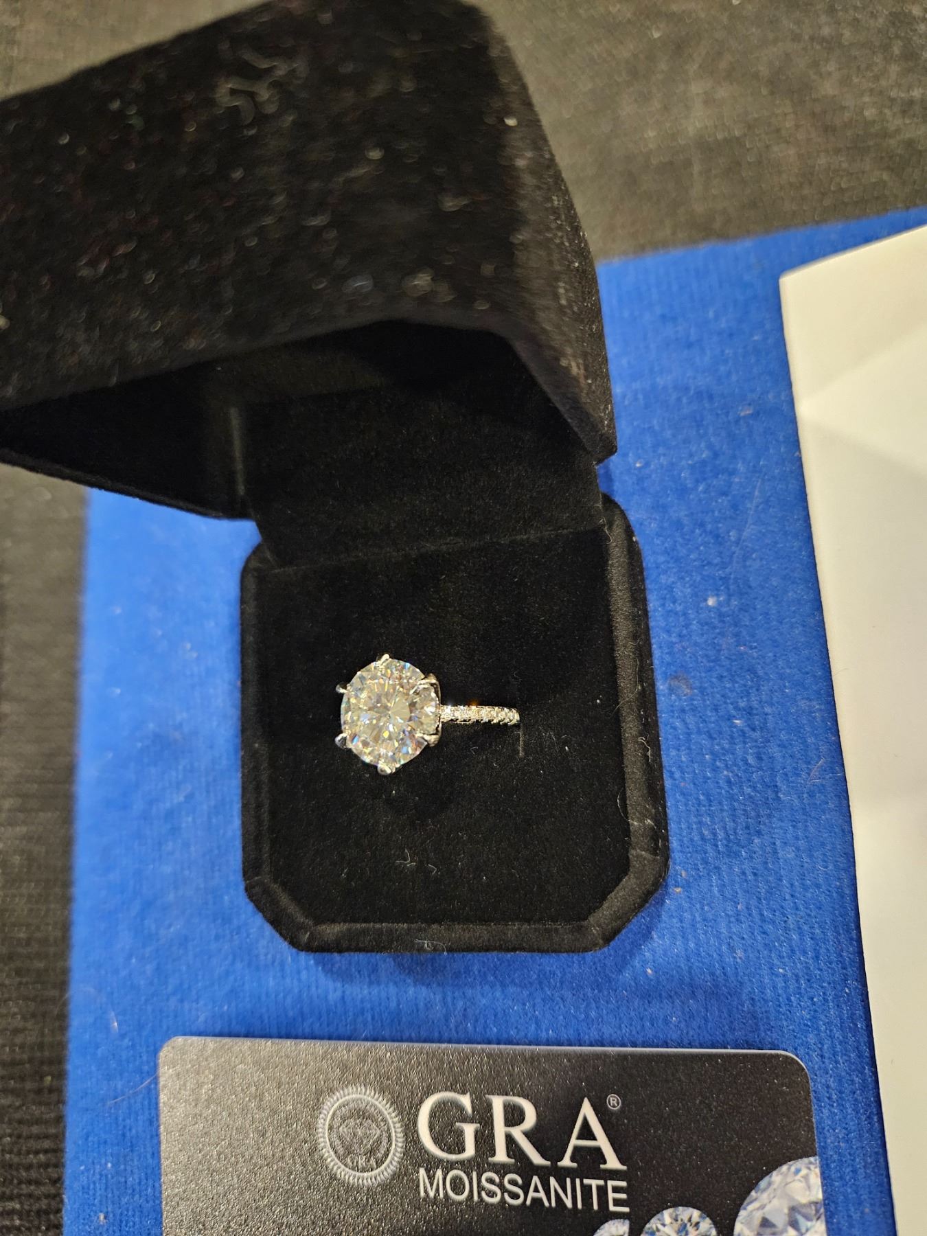 5.00 CT GRA CERTIFIED ROUND BRILLIANT CUT MOISSANITE STONE VVS D COLOR SET IN CENTER WITH 14 ROUND BRILLIANT CUT CUBIC ZIRCONIA AND SET IN SHANK SET IN 925 SILVER RING SIZE 5.25 RETAIL VALUE $3,145.00